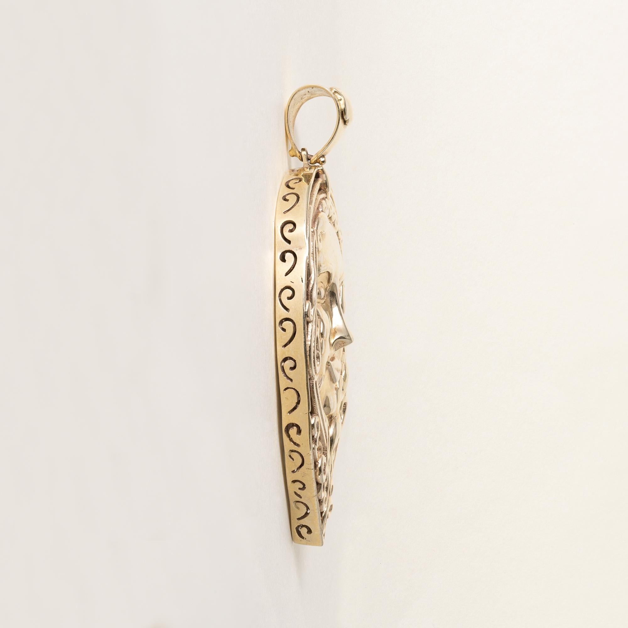 This is a 14K solid gold pendant featuring a ladies face