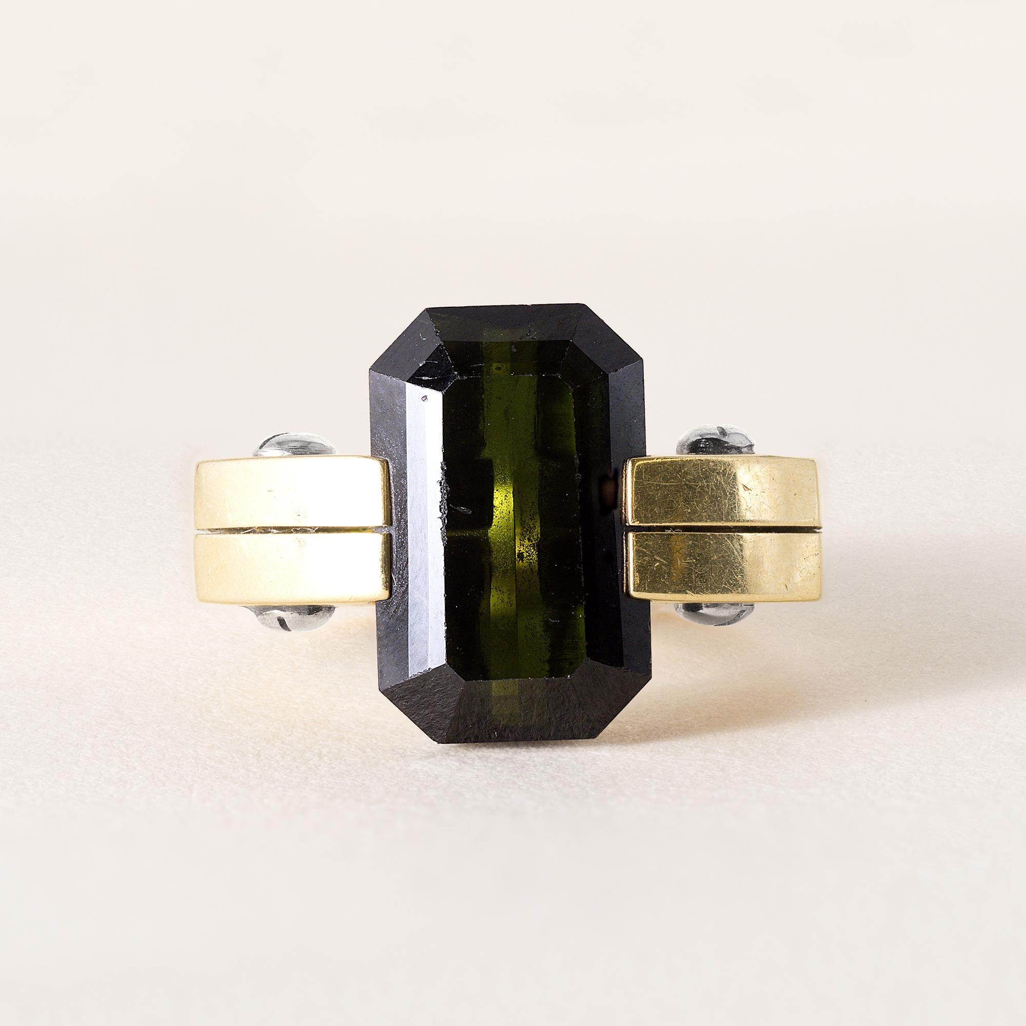 This is a vintage Italian ring featuring a dark green tourmaline gemstone