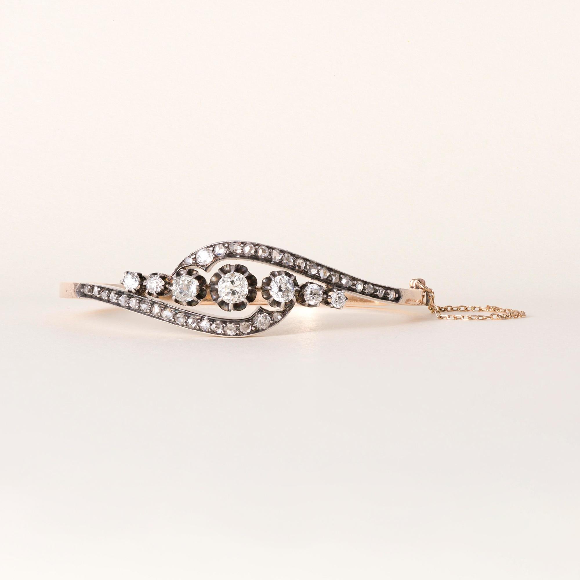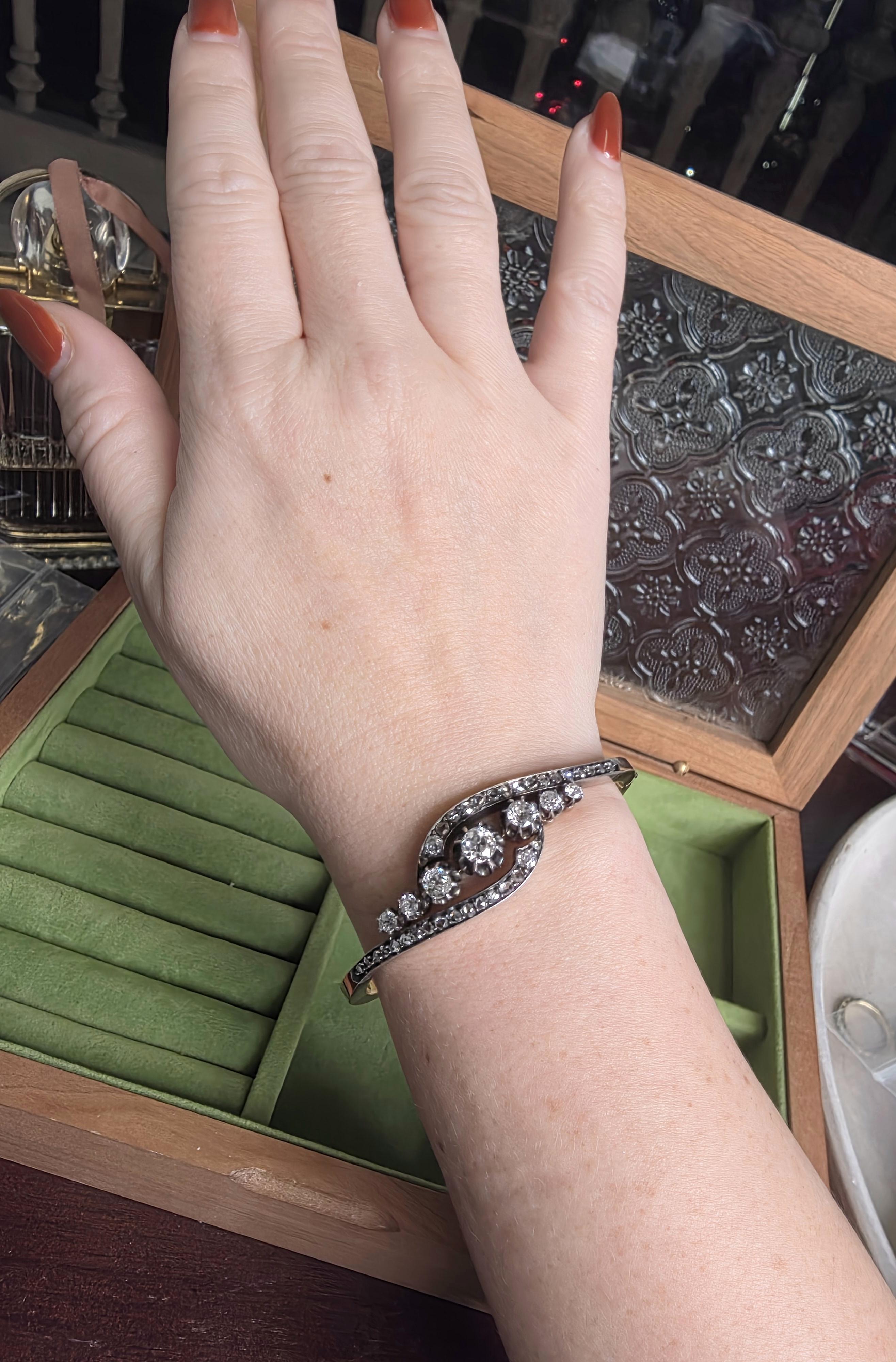 An exceptional example of mid-19th century French jewelry, this antique cuff bangle dates to the Napoléon III period and showcases the refined craftsmanship and romantic ornamentation characteristic of the era. The bracelet is crafted in a traditional combination of rose gold and silver, a hallmark of period diamond jewelry designed to enhance brilliance under candlelight.