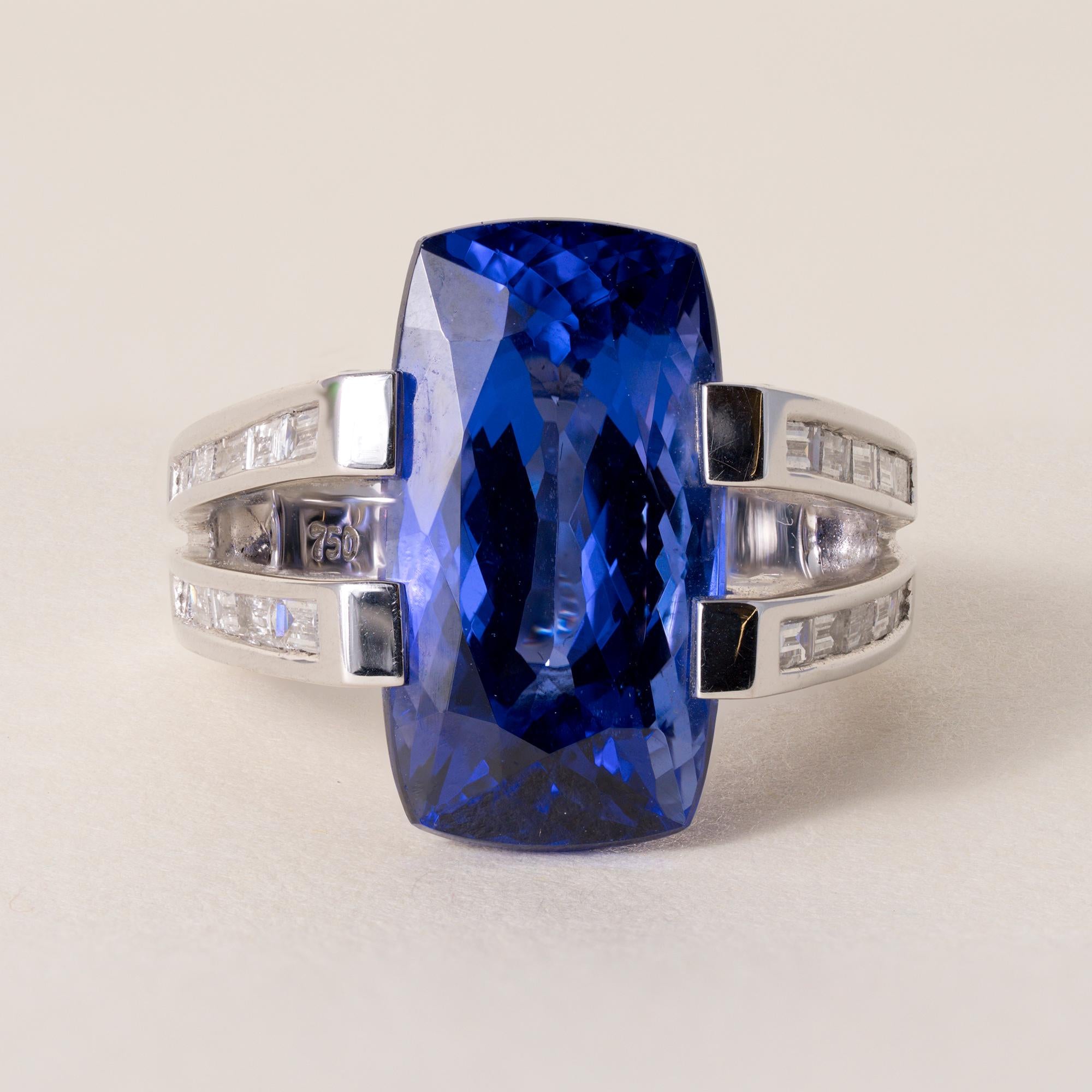 This striking estate ring is crafted in 18K white gold and showcases a vivid blue elongated cushion-cut tanzanite weighing an impressive 11.56 carats.