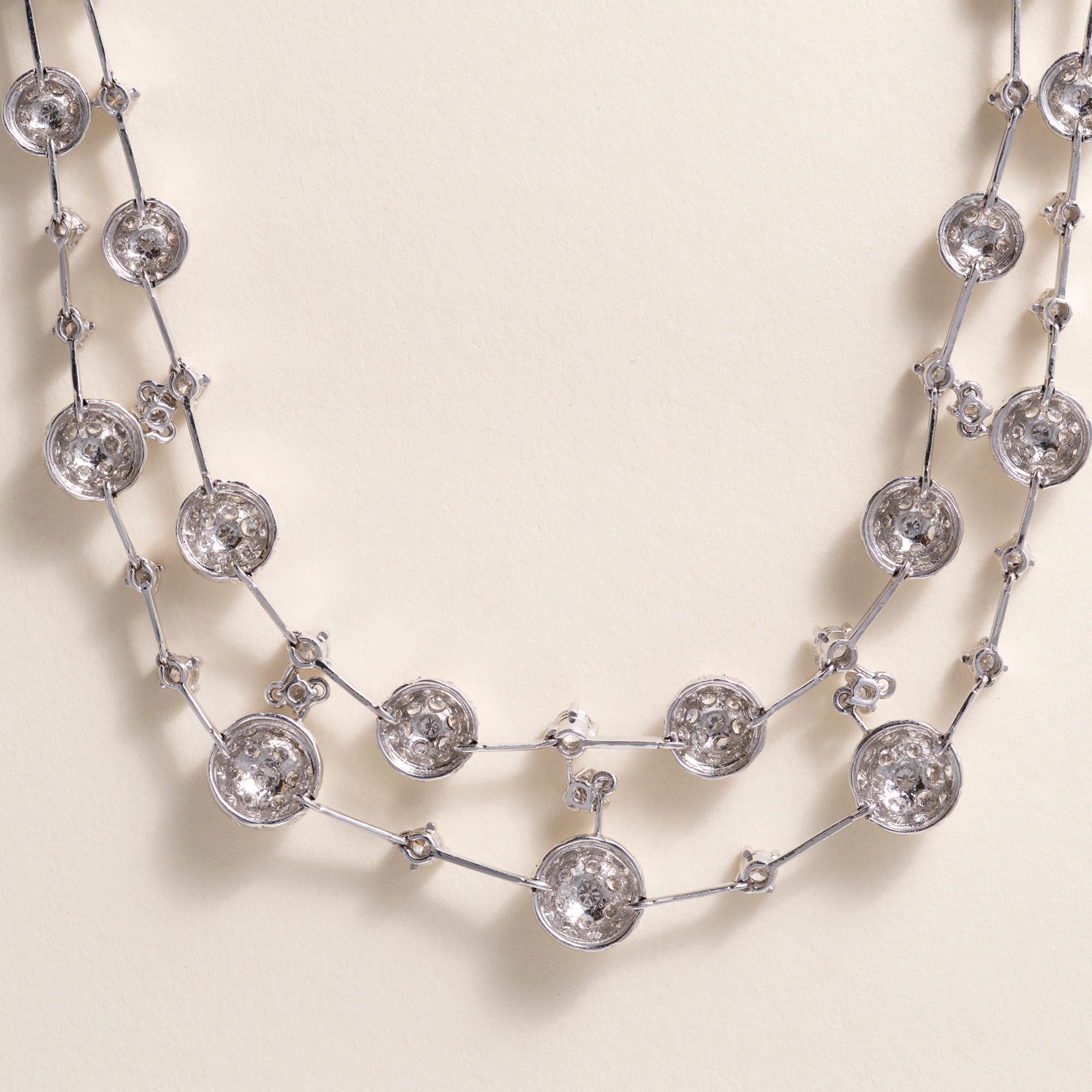 The necklace features double rows of round brilliant diamonds set into softly puffed, domed circular links, creating beautiful dimension and fluid sparkle across the neckline. The combination of prong and pavé settings enhances the brilliance of the diamonds while maintaining a refined, luxurious presence. It sits gracefully at the collarbone, making it ideal for both evening wear and elevated everyday styling.