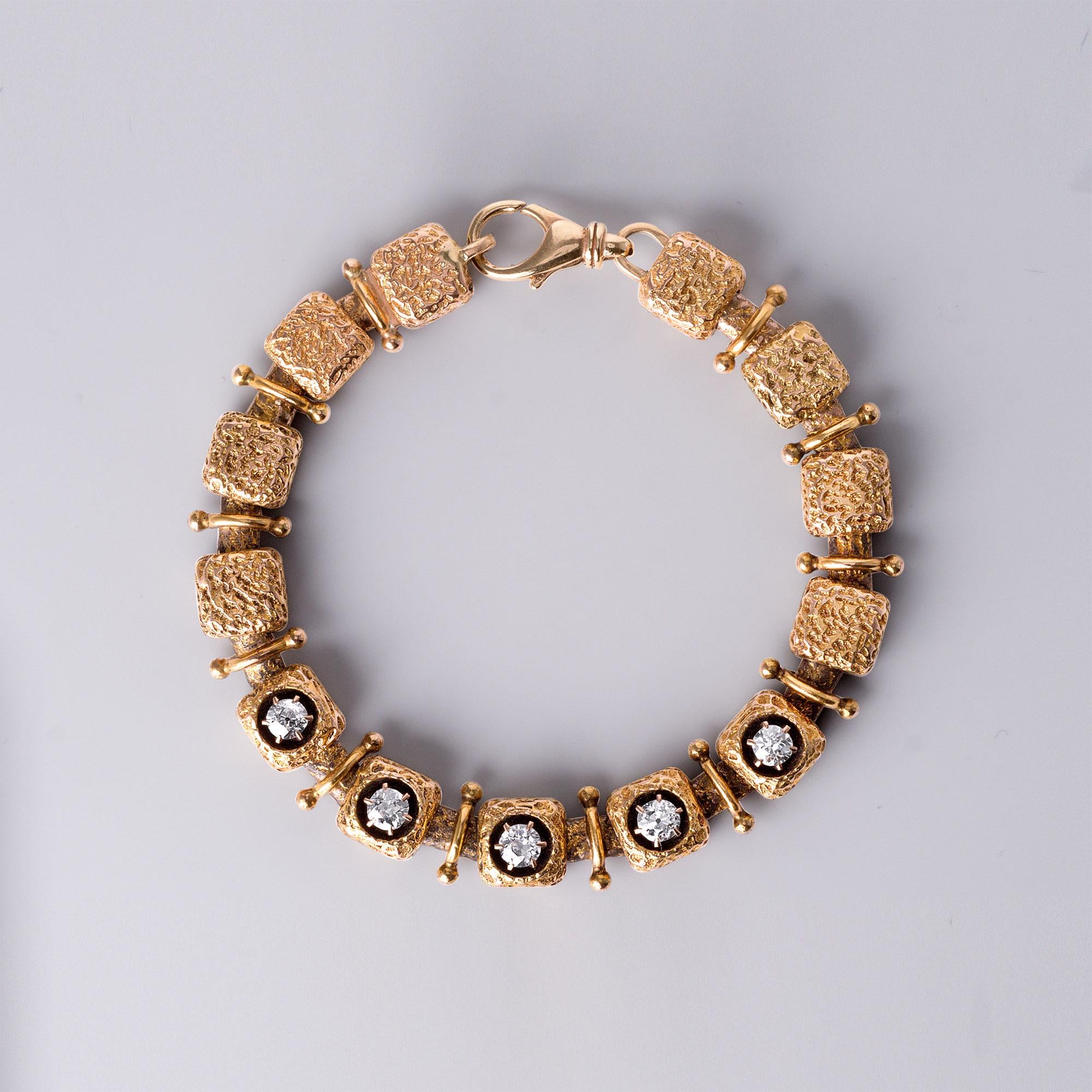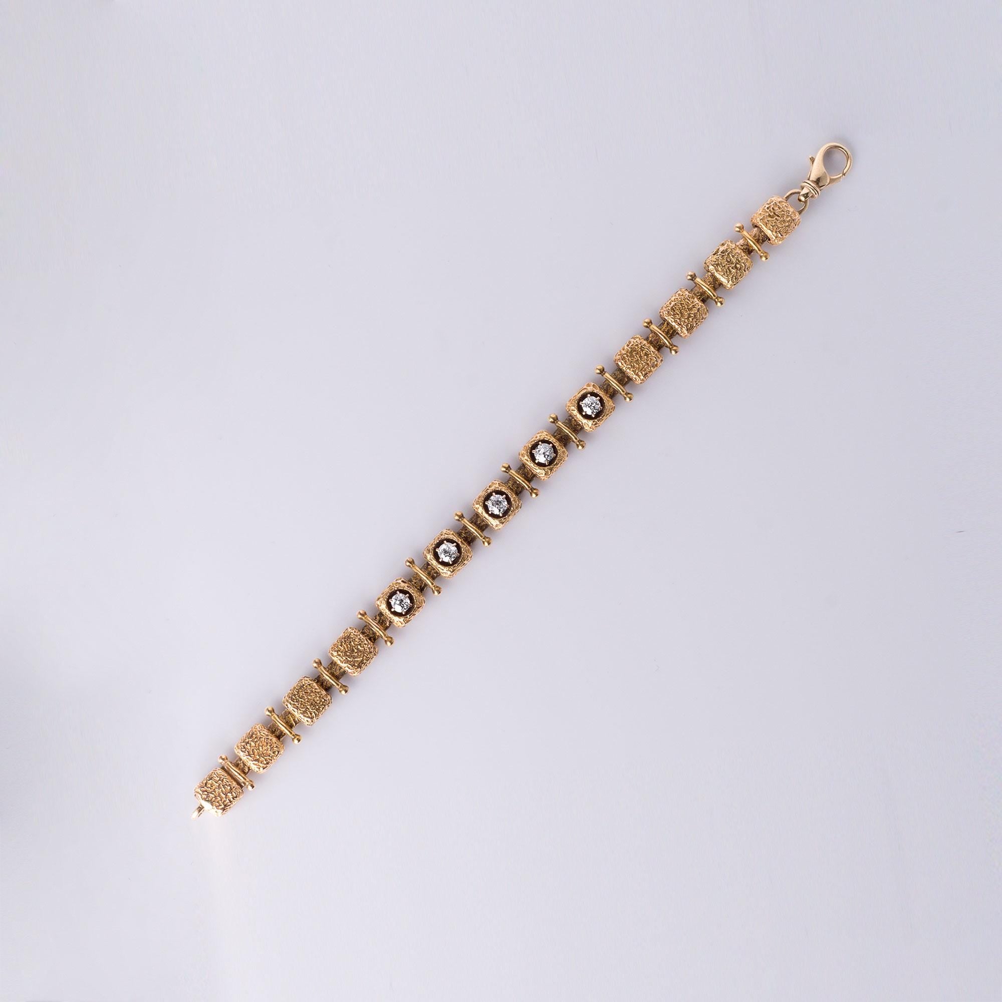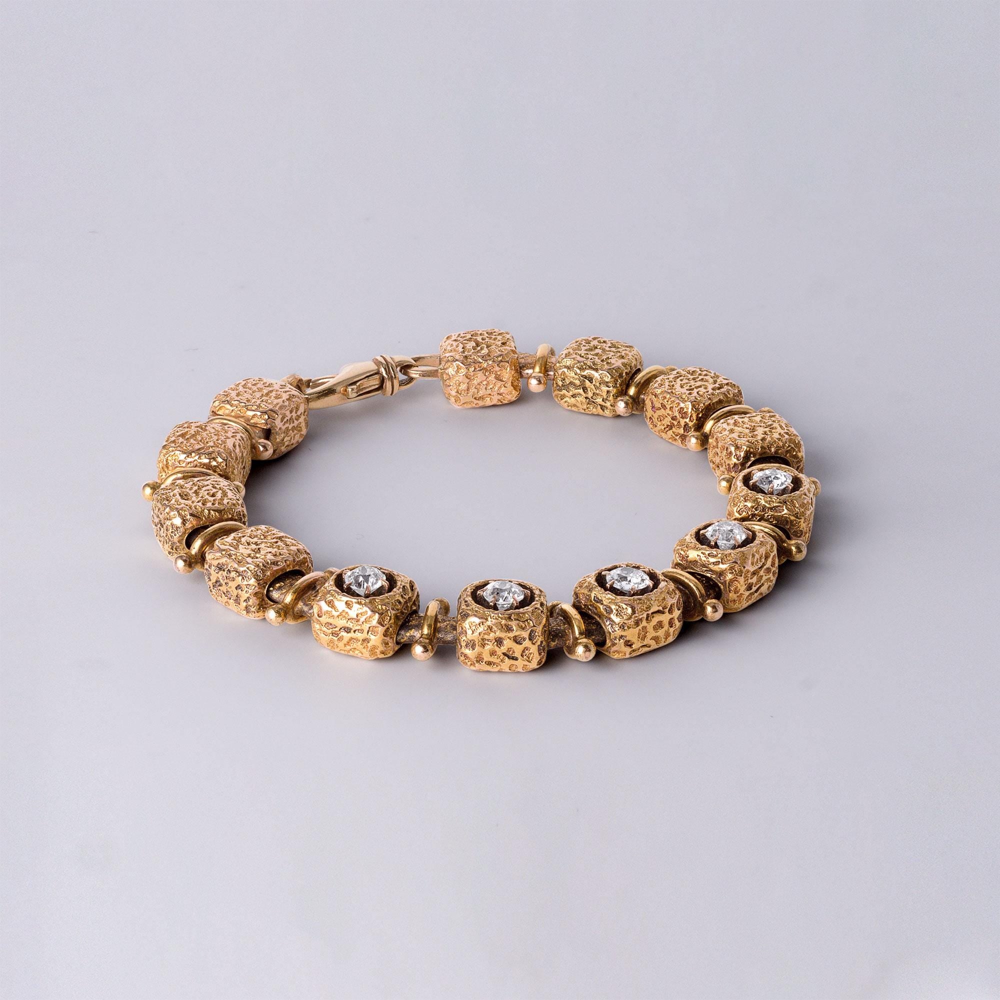 Timeless and substantial, this bracelet combines antique diamond cuts with a modernist design, perfect for collectors of fine vintage or geometric gold jewelry.