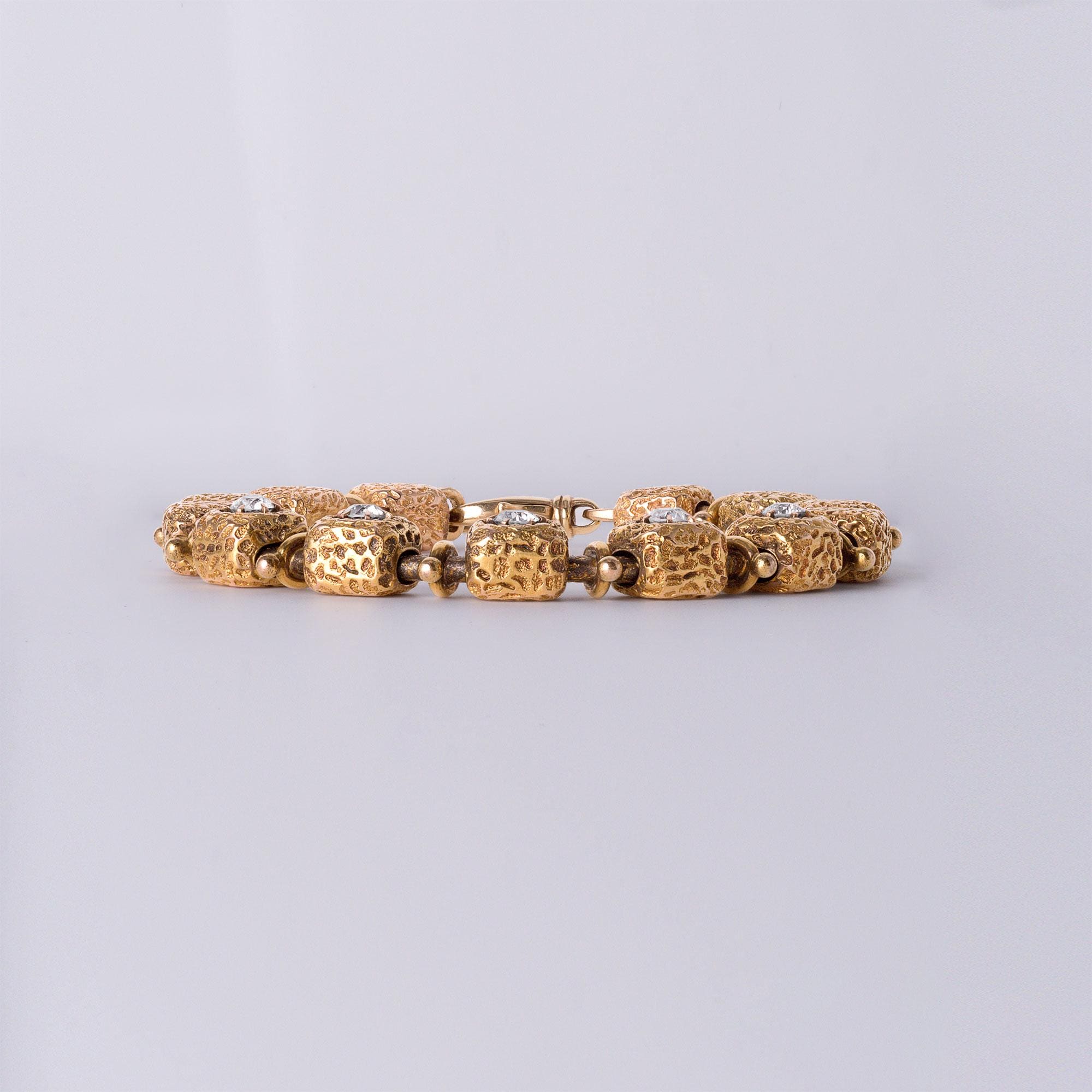 Victorian meets Brutalist Era! This one-of-a-kind vintage 14K gold bracelet features a captivating blend of geometry, texture, and sparkle.