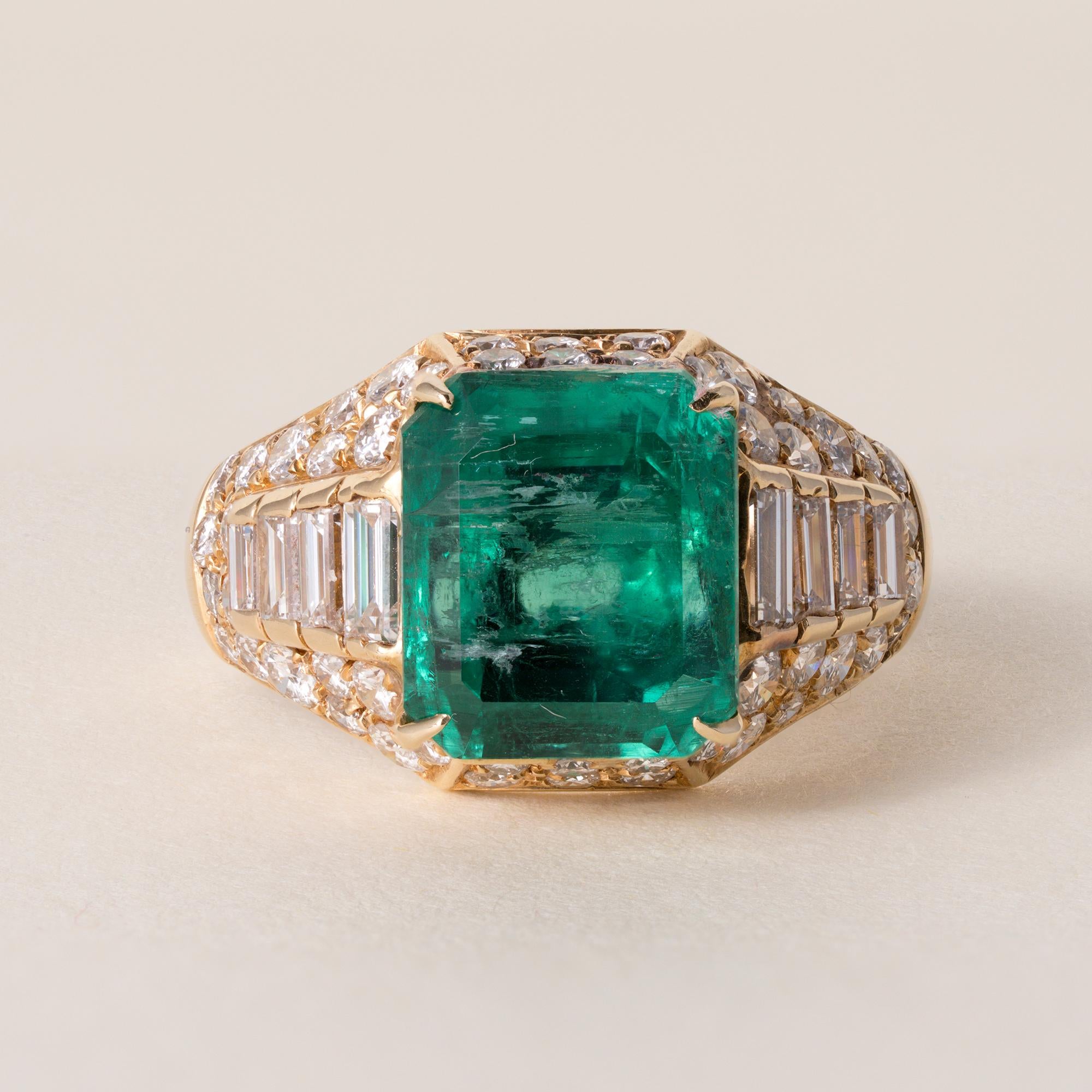 This is a vintage emerald ring featuring a vivid Zambian emerald, accented by baguette and round brilliant diamonds, all set in 18 karat gold.