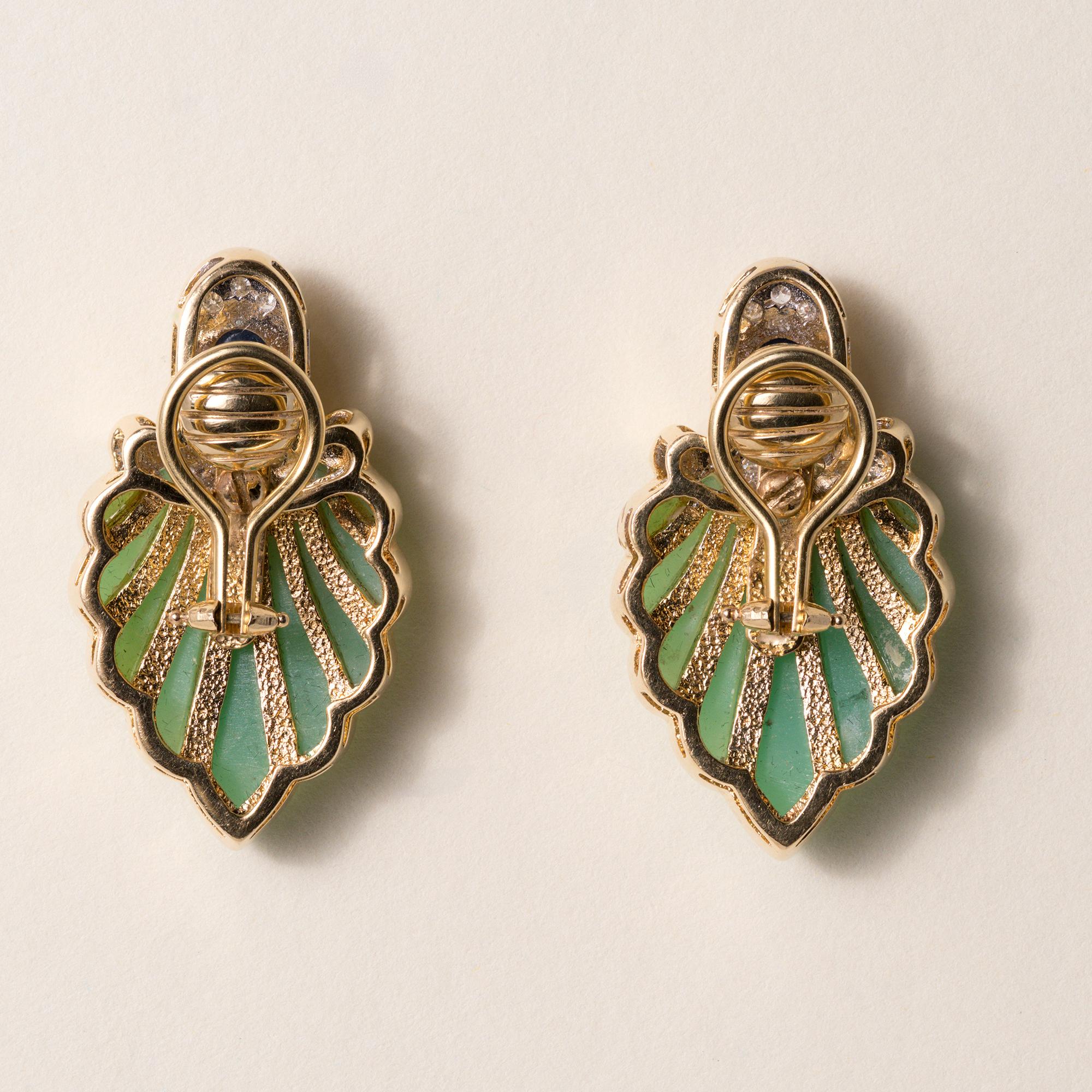 A beautifully romantic pair of vintage clip-on earrings showcasing carved chrysoprase in an elegant leaf motif, accented with rich blue sapphires and sparkling diamonds. Crafted in 18K yellow gold, these earrings reflect the bold yet organic design aesthetic popular in the 1960s.