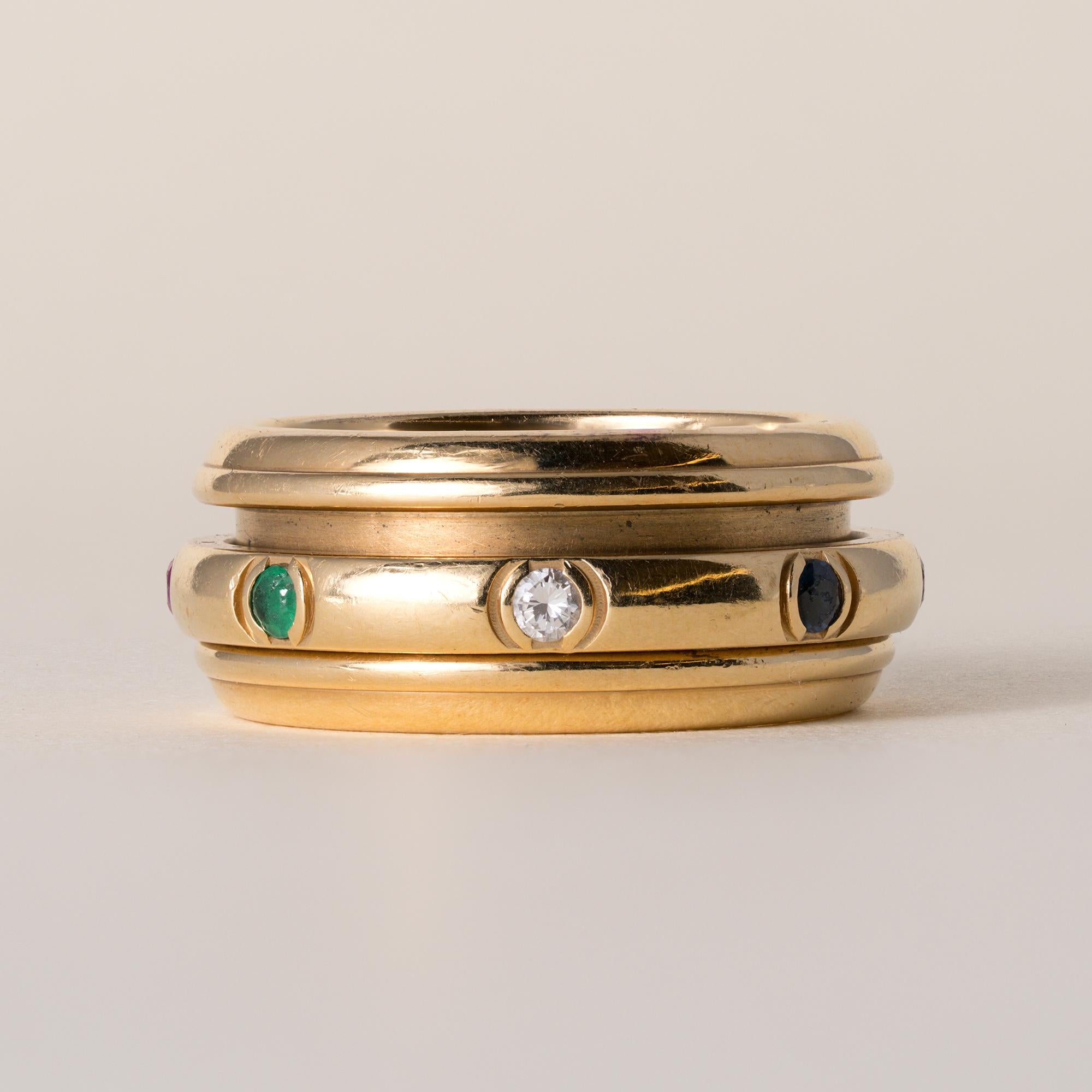 An iconic vintage Piaget Possession spinner ring in 18K yellow gold, featuring a rotating band set with emeralds, rubies, sapphires, and diamonds.
