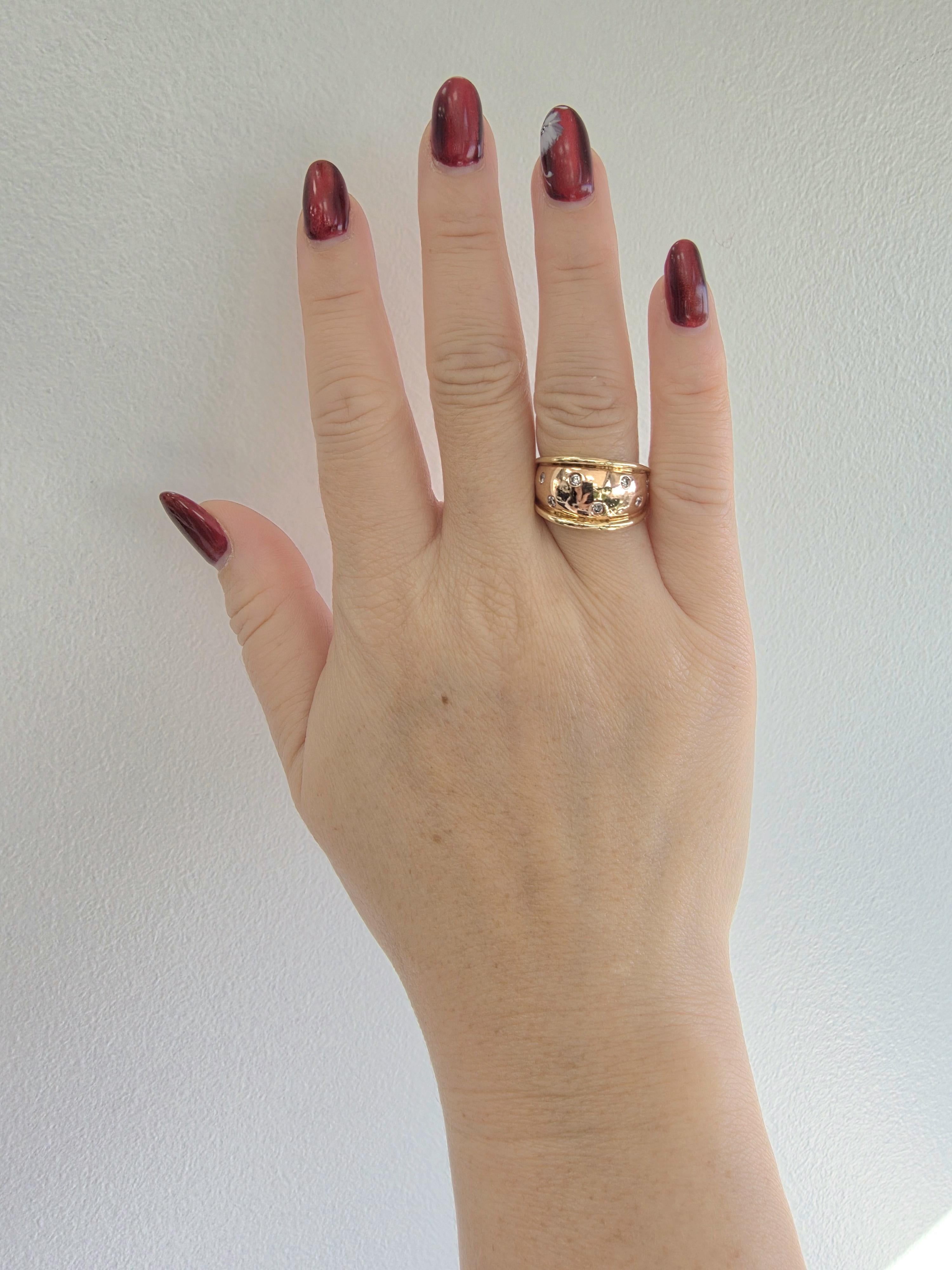 This is a vintage rose gold dome ring with flush set diamonds