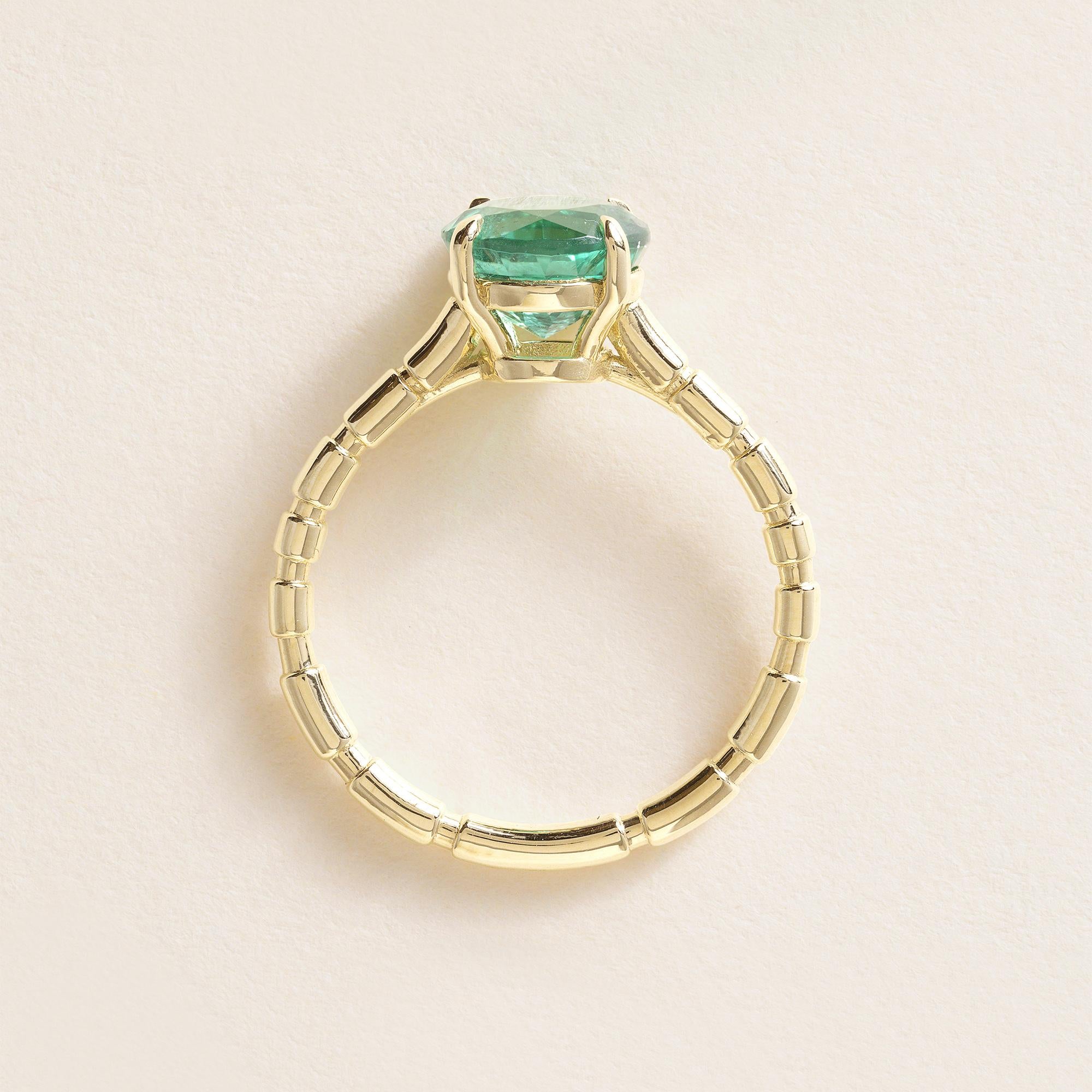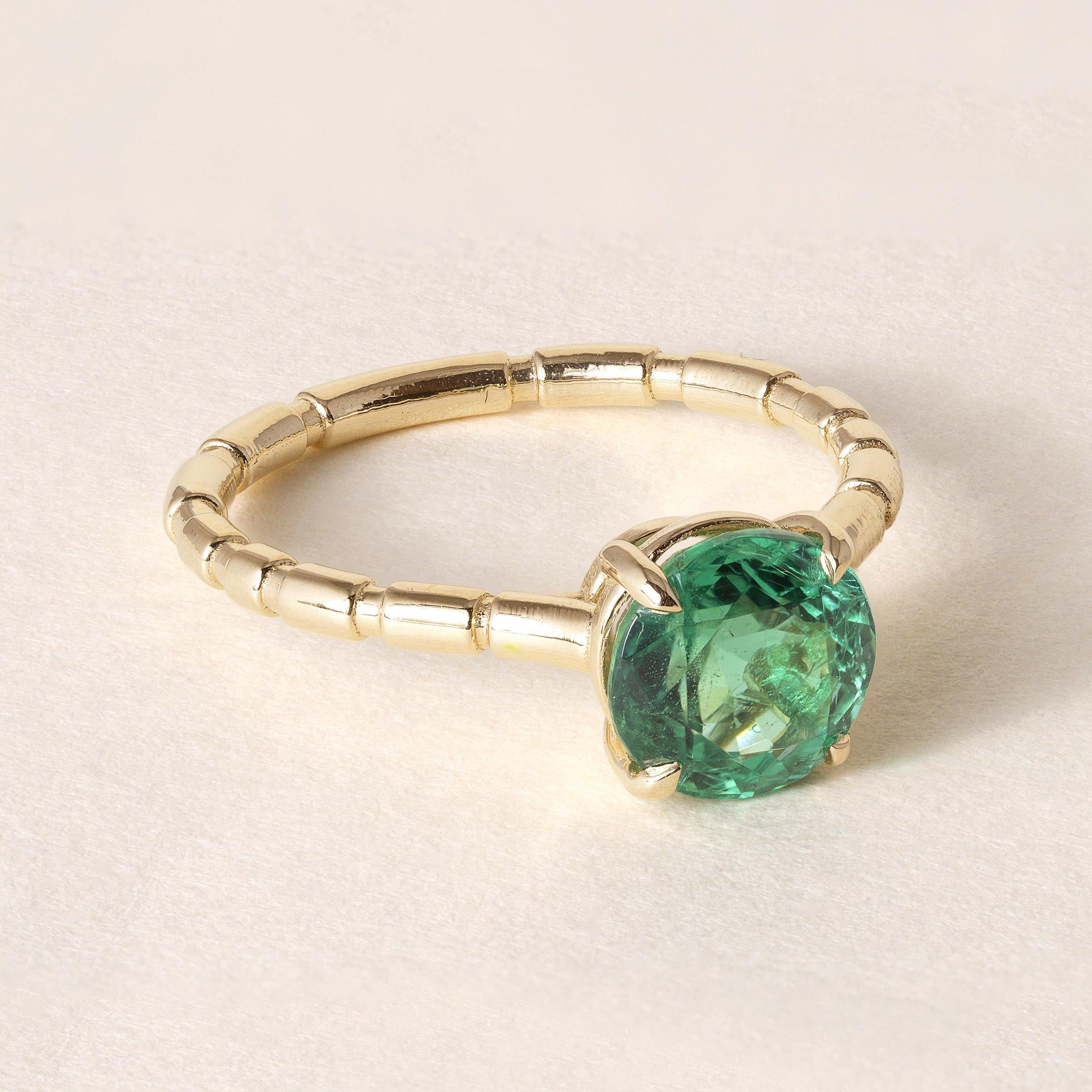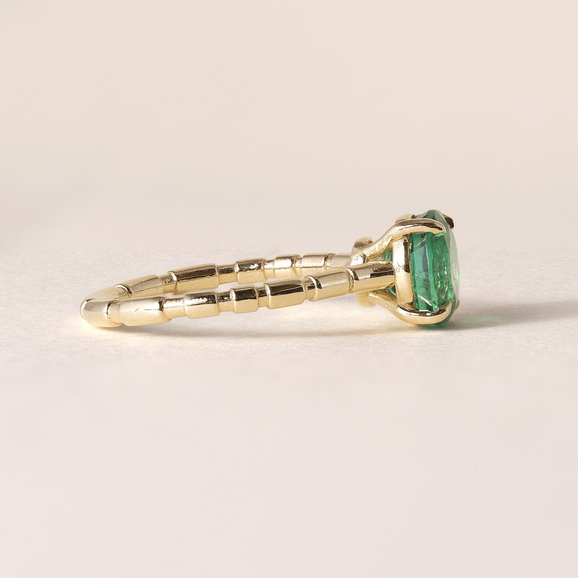This is a Zambian emerald round brilliant cut in an 18k gold solitaire ring
