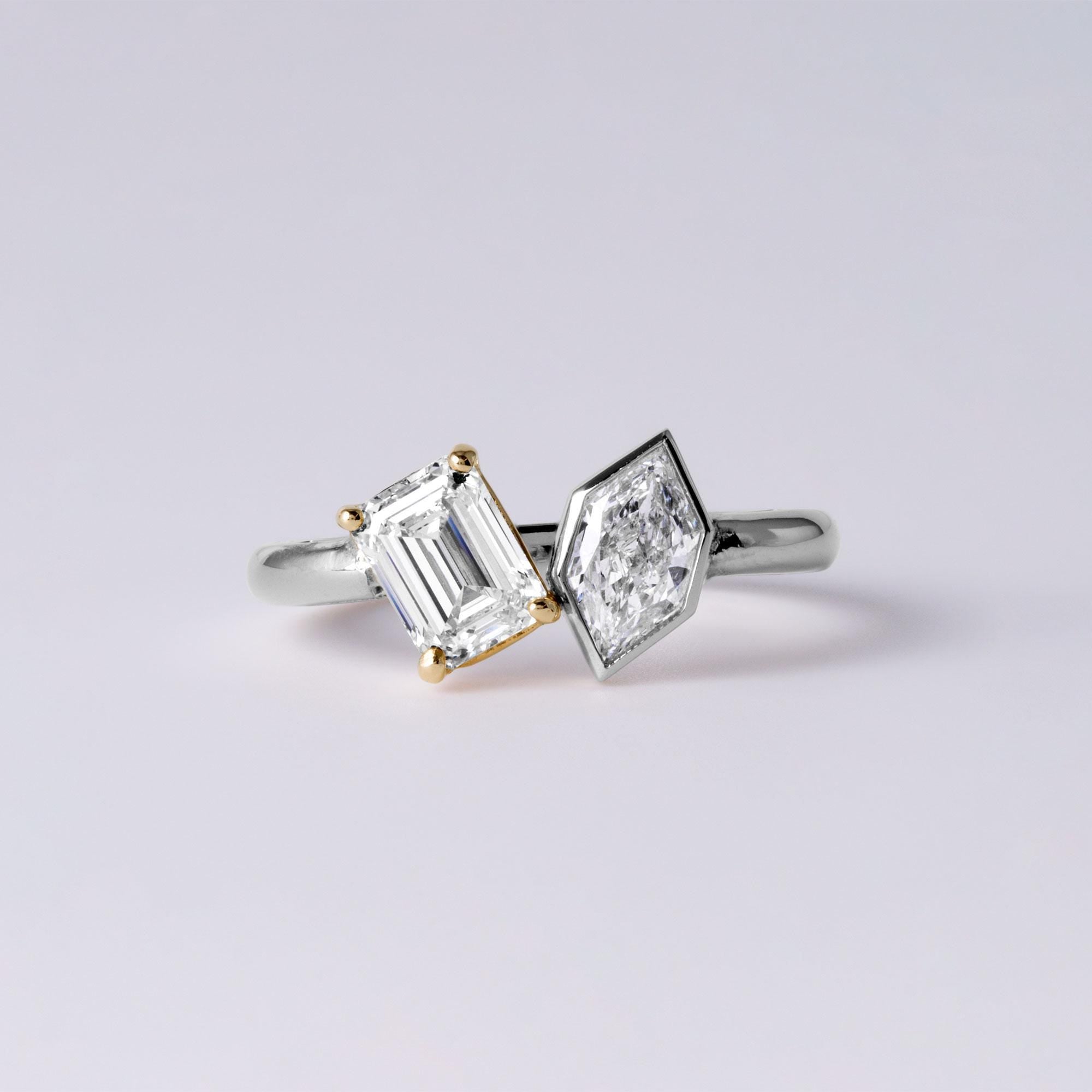 A contemporary take on the romantic toi et moi ("you and me") style, this elegant diamond ring features an eye-catching pairing of an emerald cut and a kite-shaped diamond, set in warm 14K 2 tone gold. This asymmetric design blends modern geometry with timeless sentiment, celebrating the union of two distinct forms in perfect harmony.
