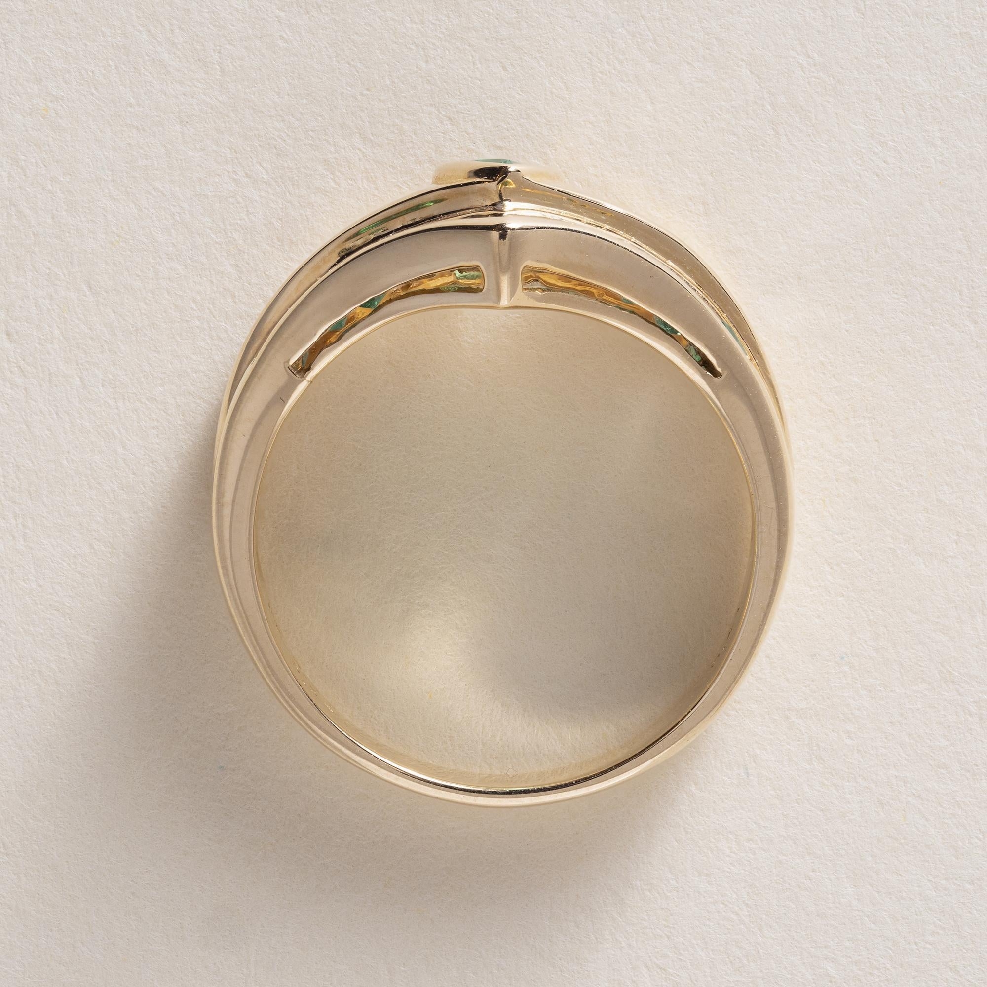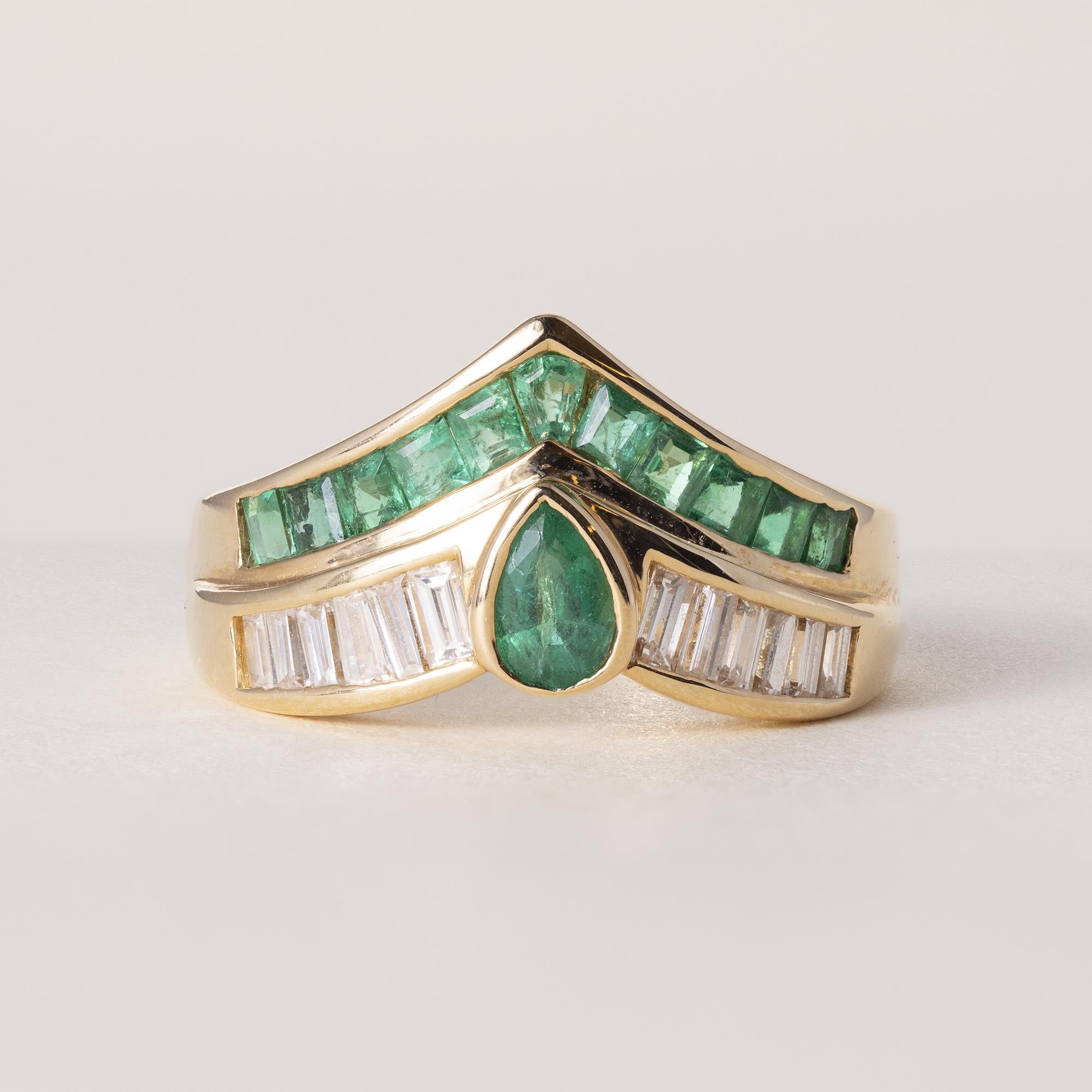 This is a vintage ring featuring a emeralds and diamonds in a crown