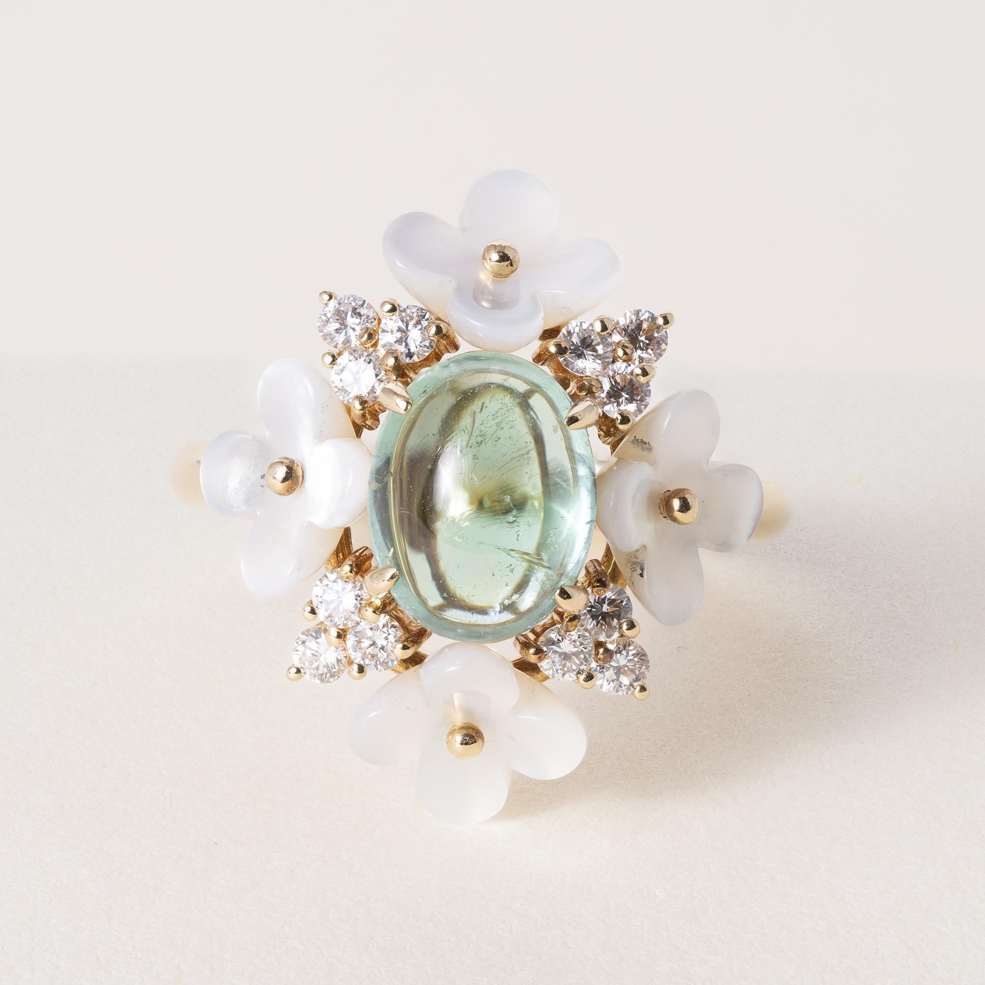 This is an 18k gold ring featuring a green cabochon, mother of pearl flowers and diamond accents