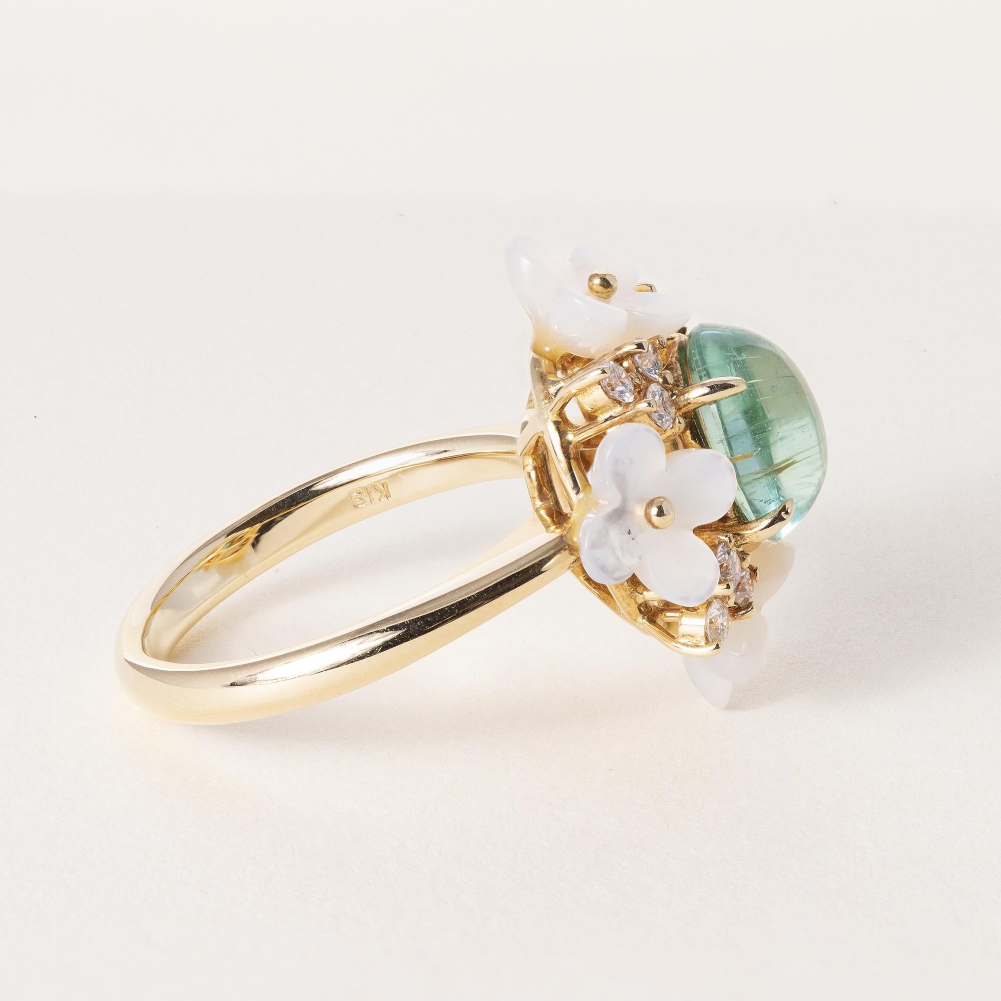 18K Gold Tourmaline Cabochon and Mother of Pearl Flower Ring