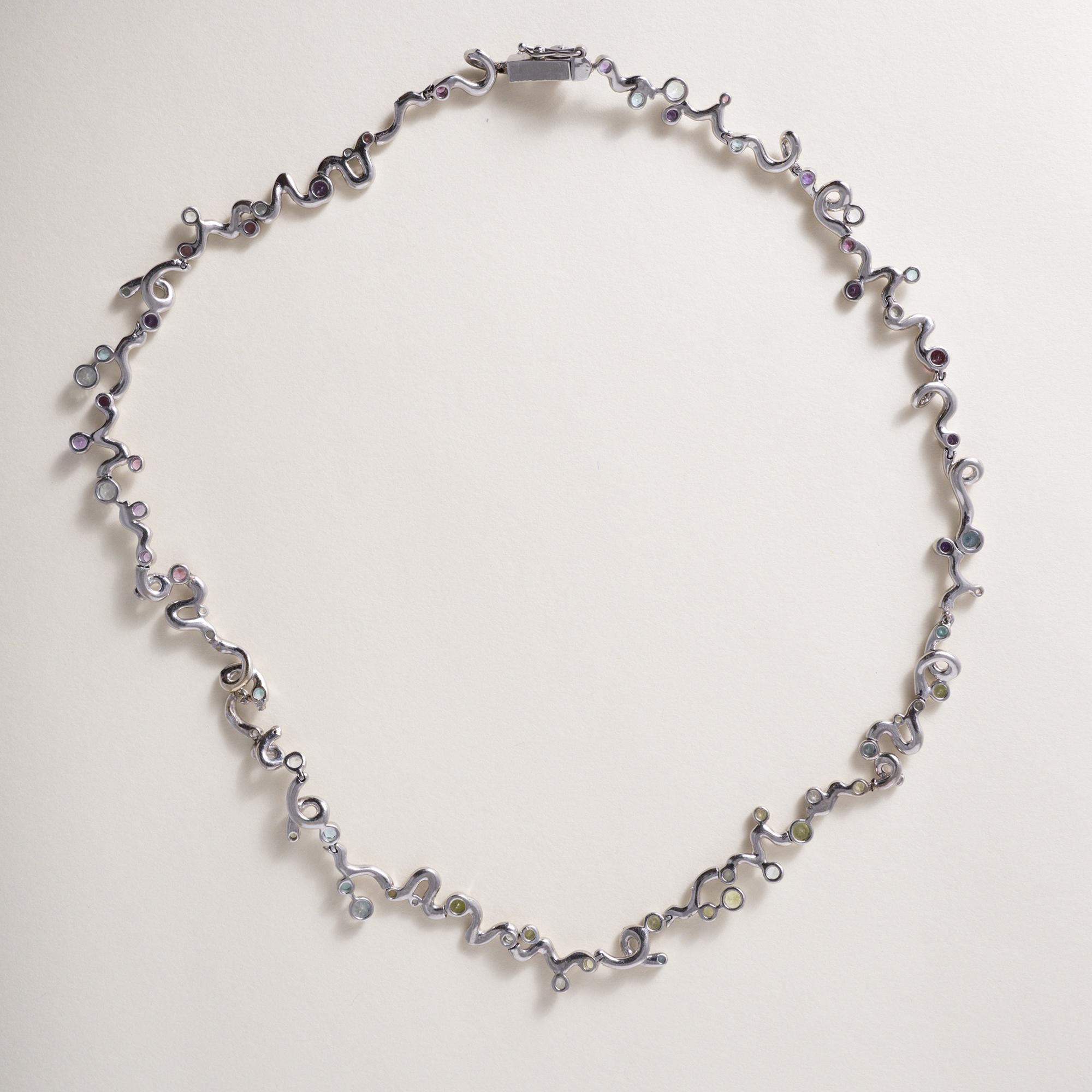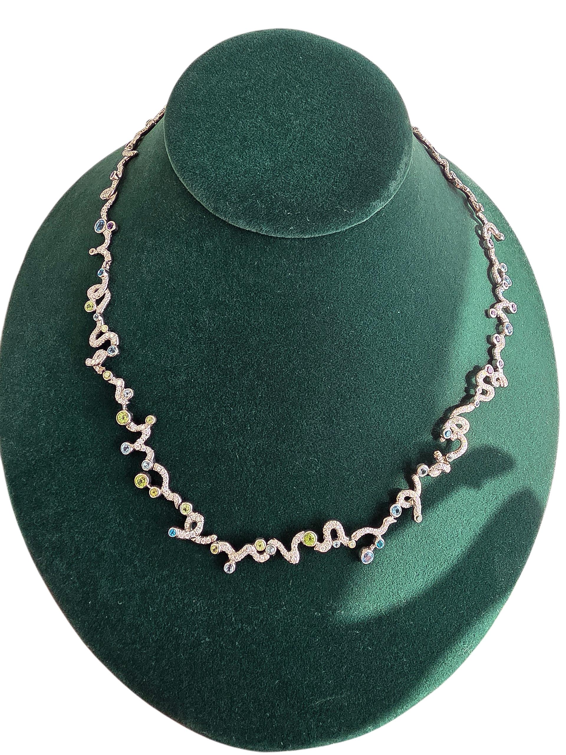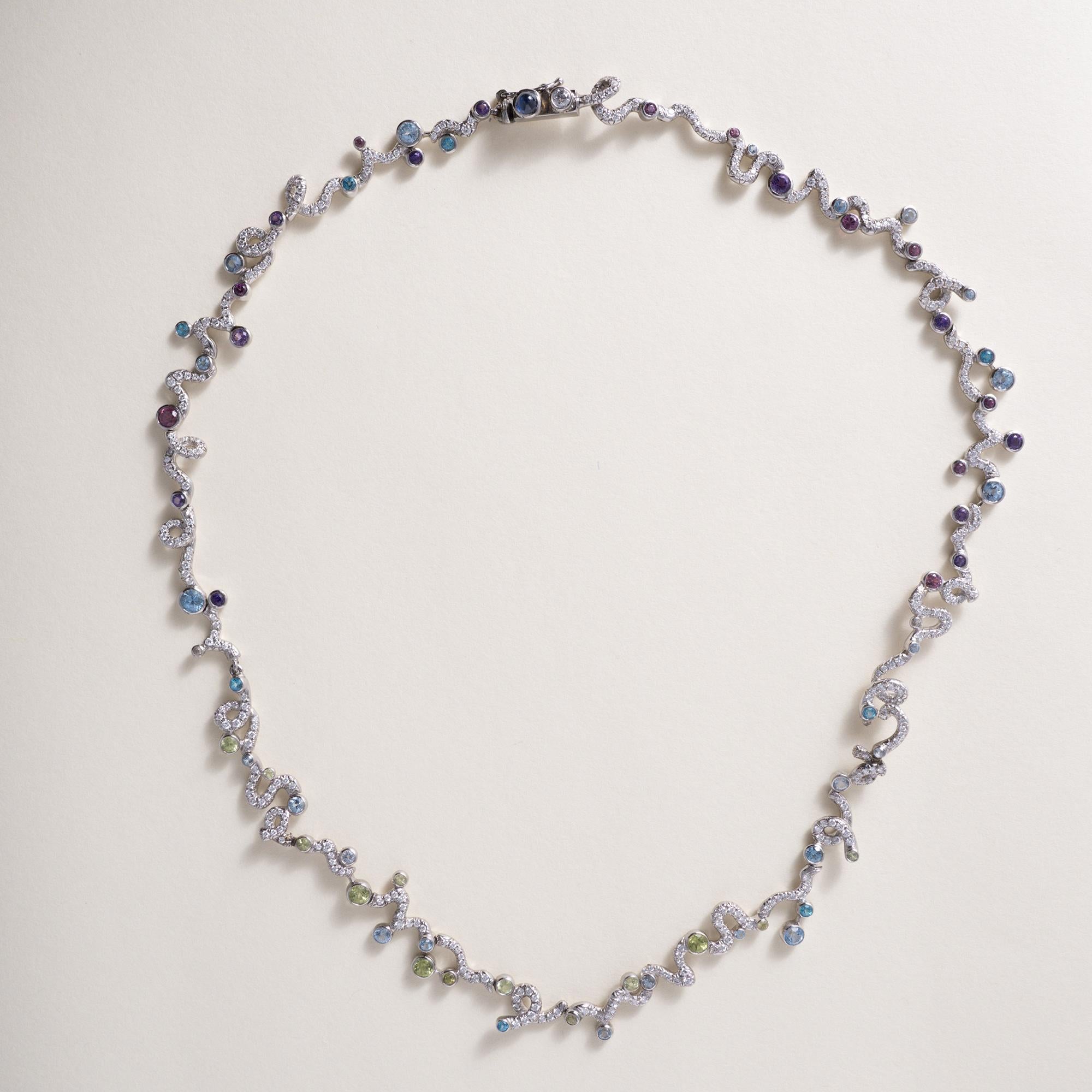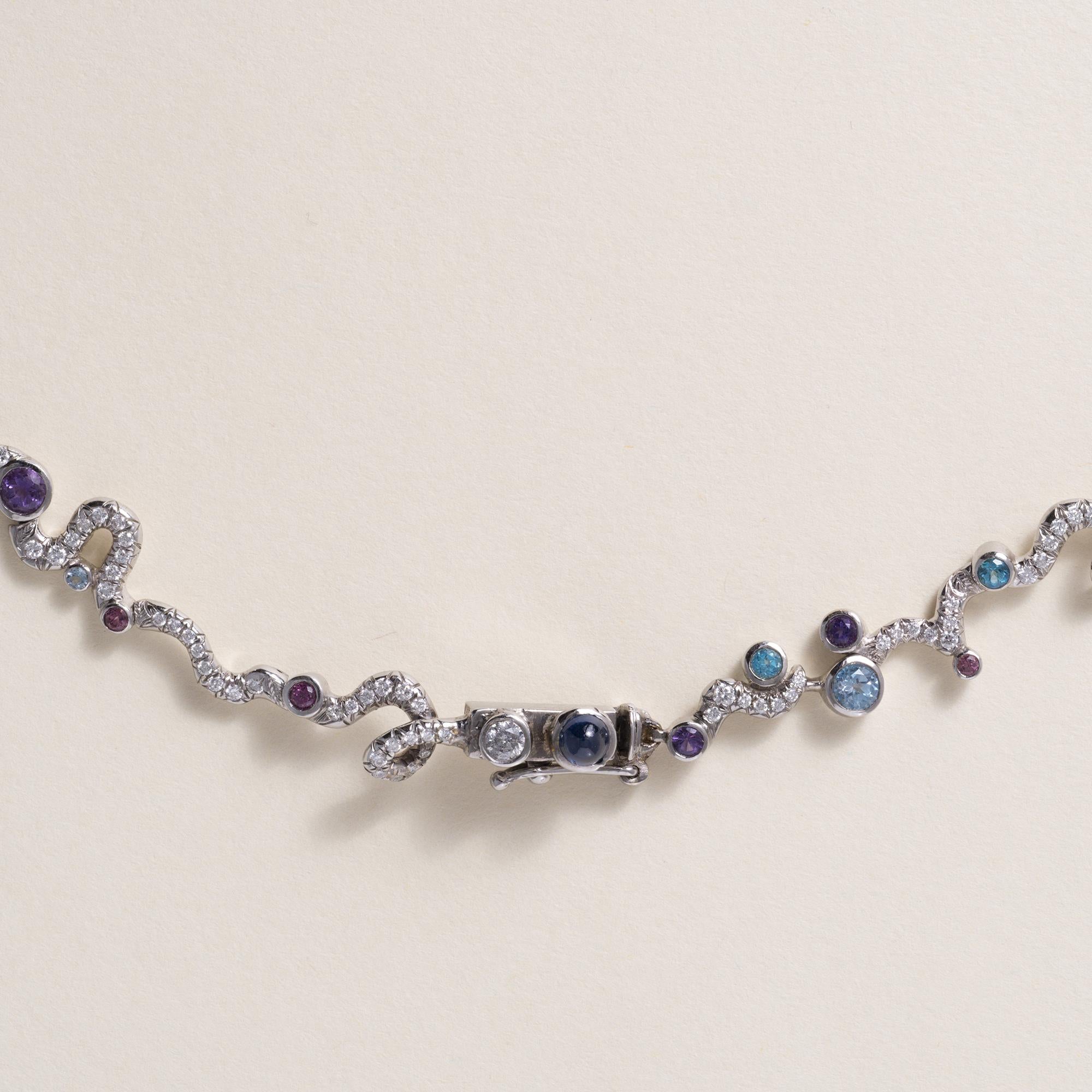 Here we have an 18K white gold diamond and multi colored gemstone necklace designed by Patrick Mauboussin with a collaboration with Kazanjian Jewelry of Beverly Hills.