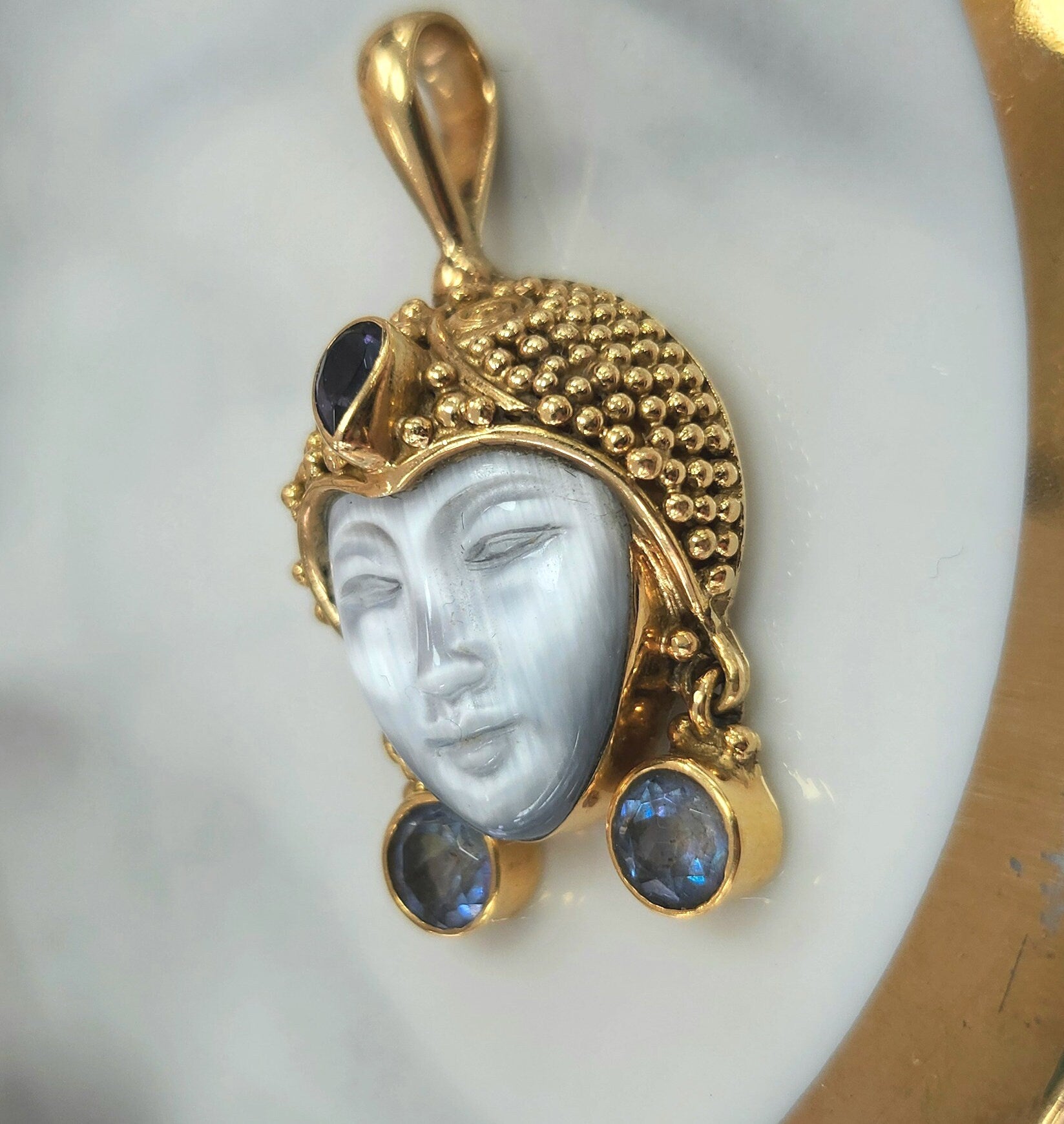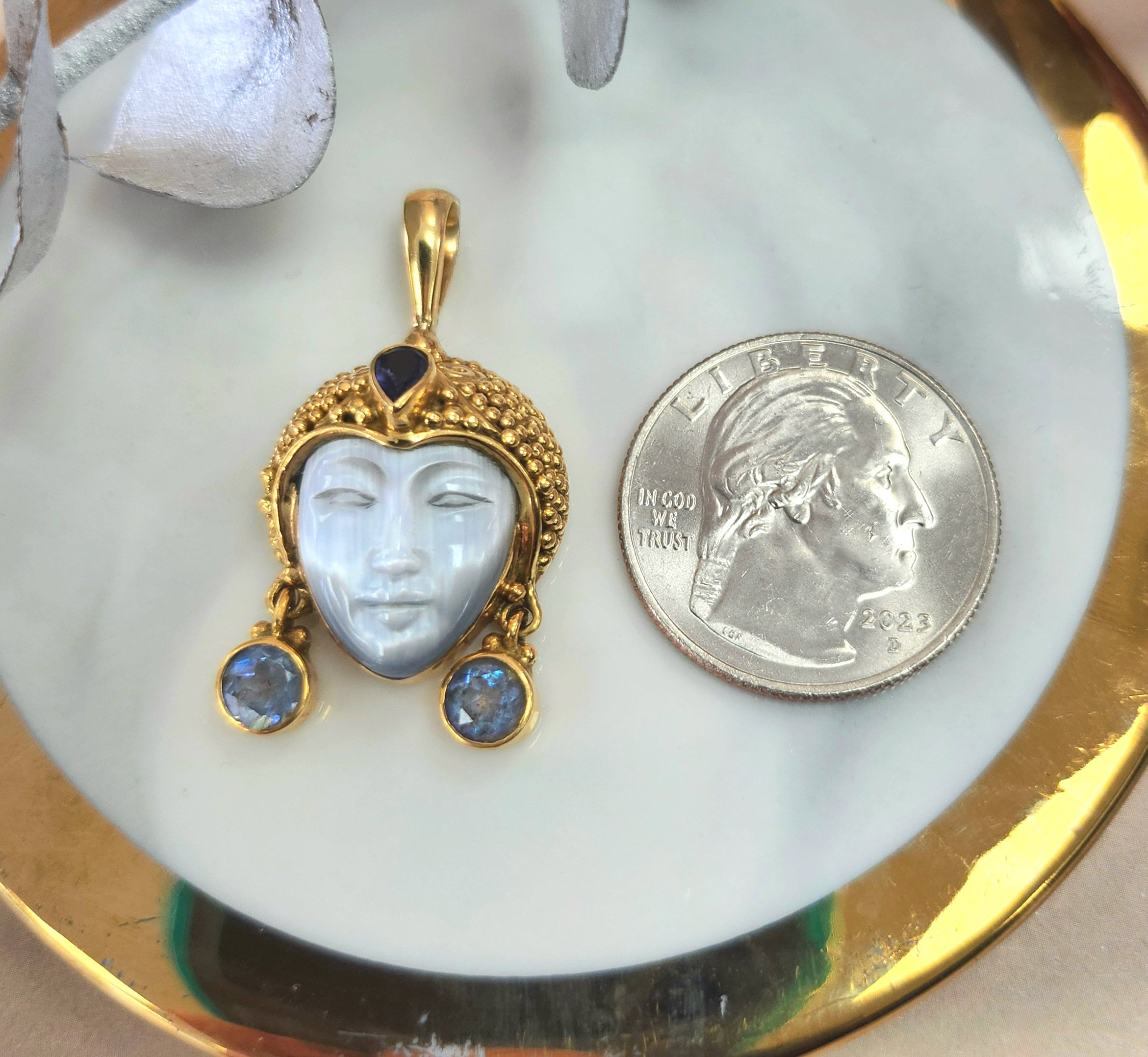 18K Yellow Gold Sajen Bali Goddess Carved Mother of Pearl, Sapphire Pendant
