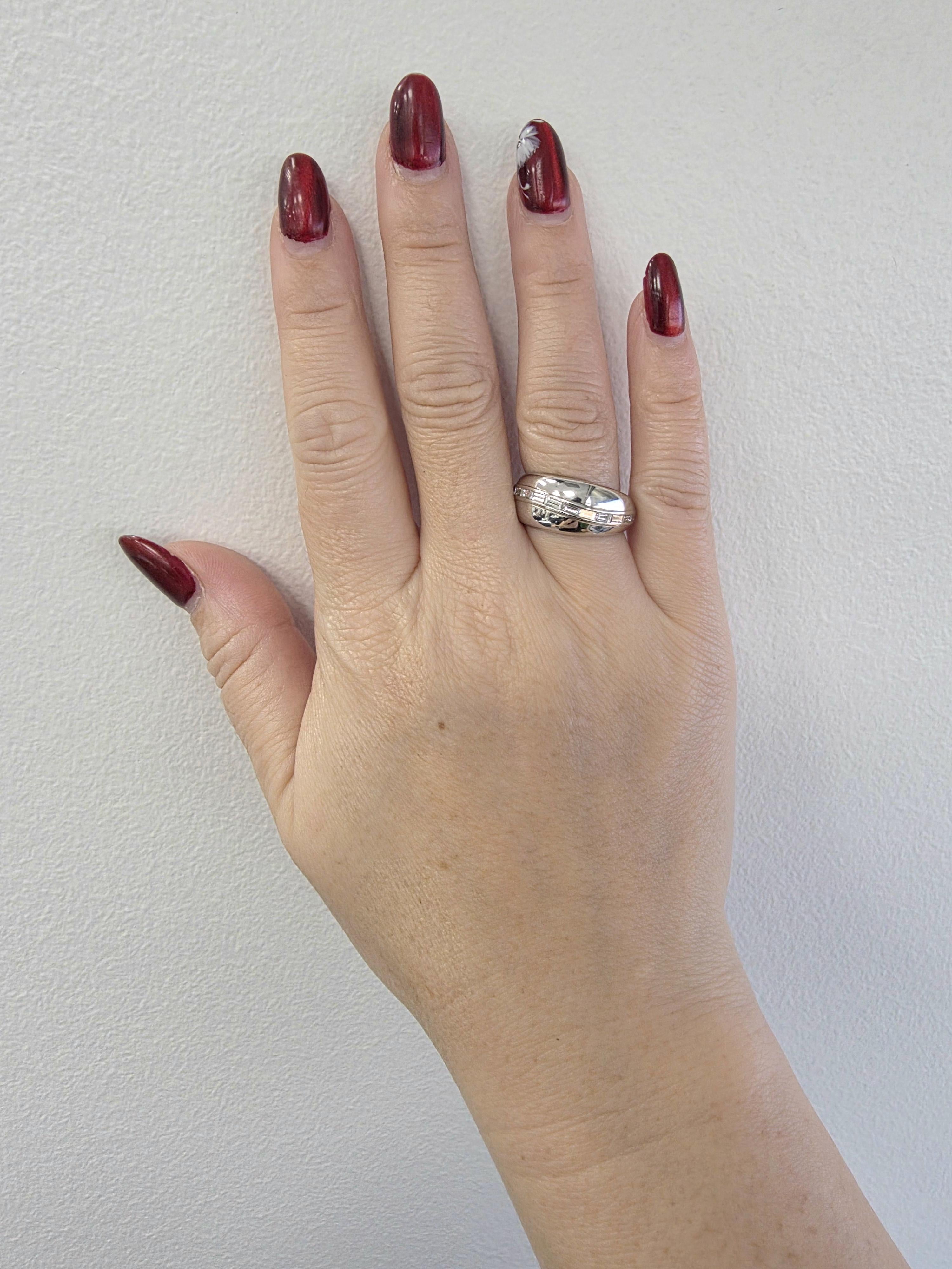 The band is comfort fit and ingeniously constructed with an internal spring mechanism that allows it to adapt between ring sizes 5 to 8, ensuring a secure and effortless fit.