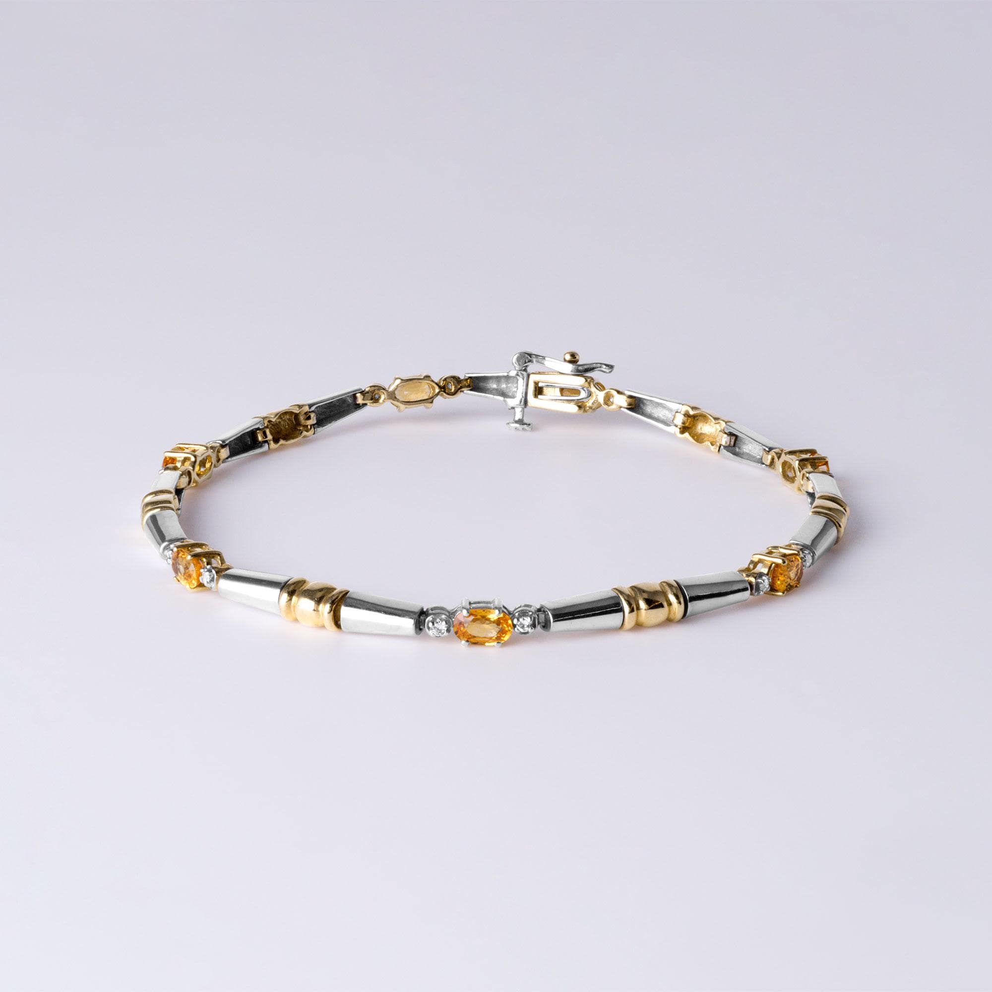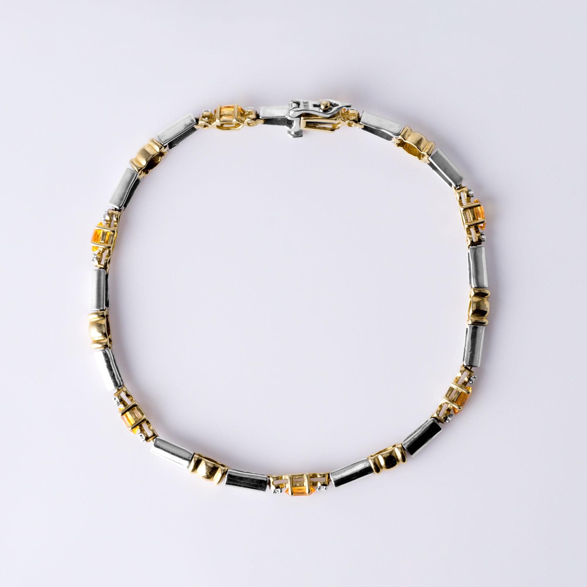 The contrast of yellow sapphires with the soft brilliance of diamonds and the warm tones of two-tone gold creates a piece that is both timeless and versatile. Whether worn alone for a refined look or layered with other bracelets for a more personalized stack, this bracelet offers effortless elegance.