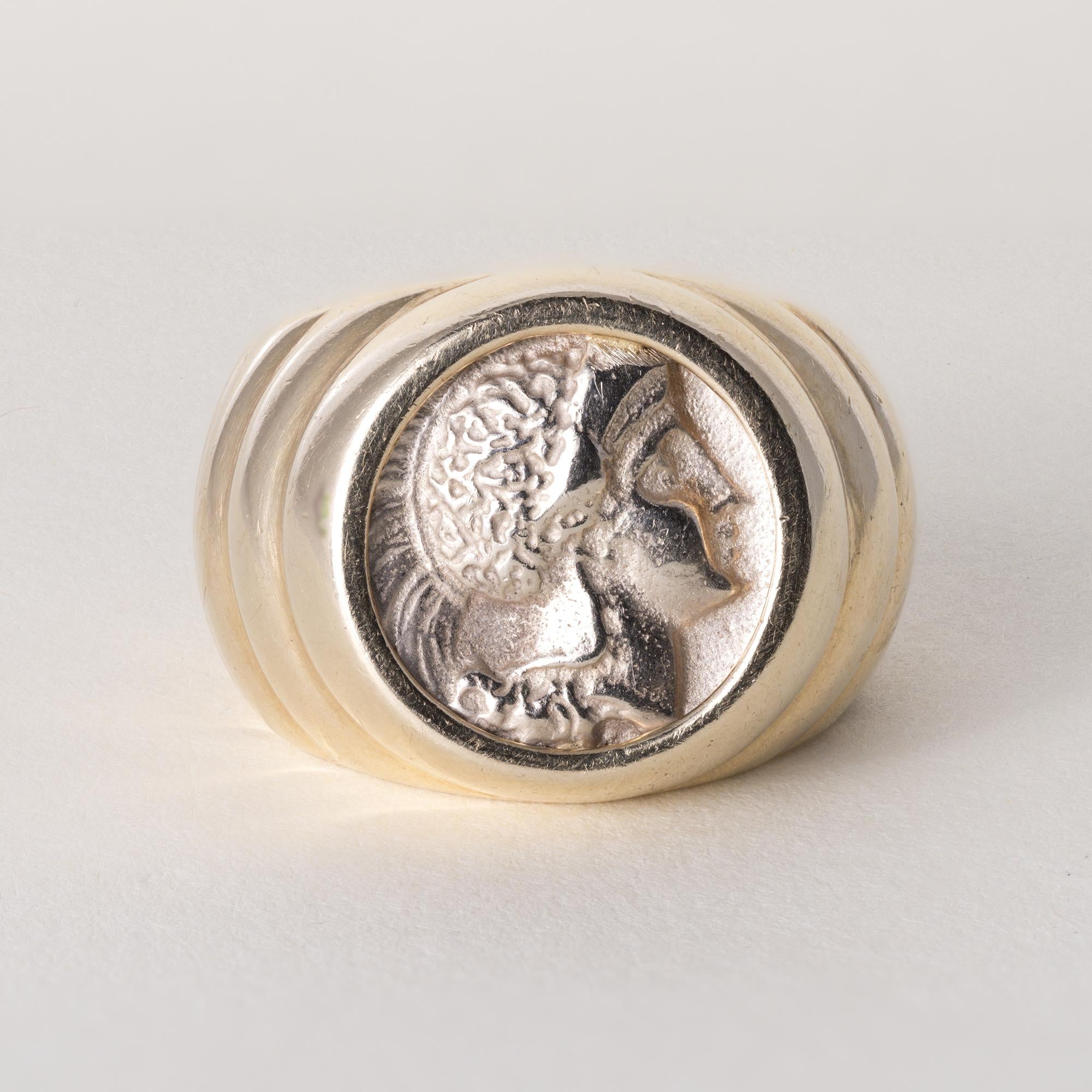 This vintage Italian ring showcases a Roman silver coin, with Caesar on the obverse and Augusta with a caricature on the reverse.
