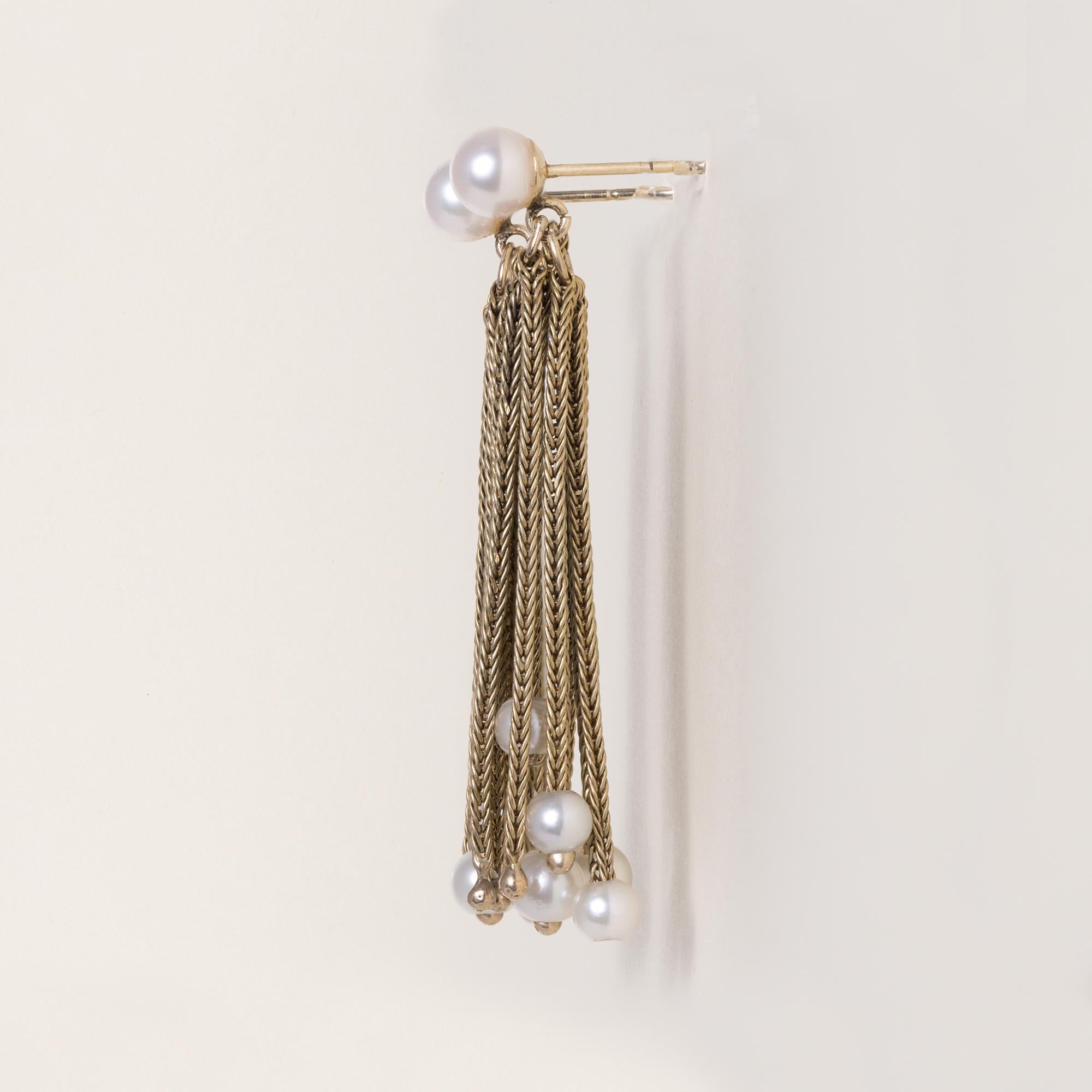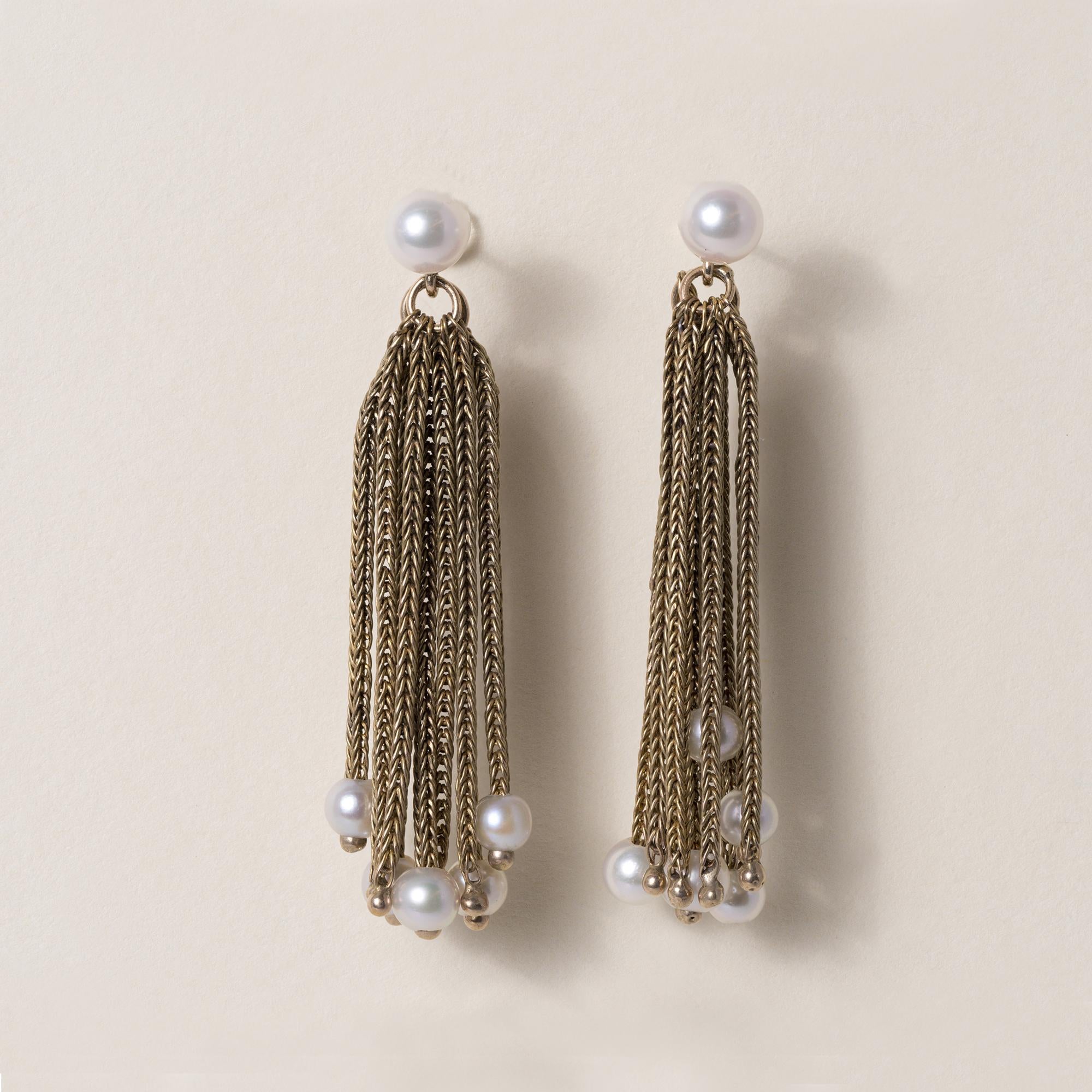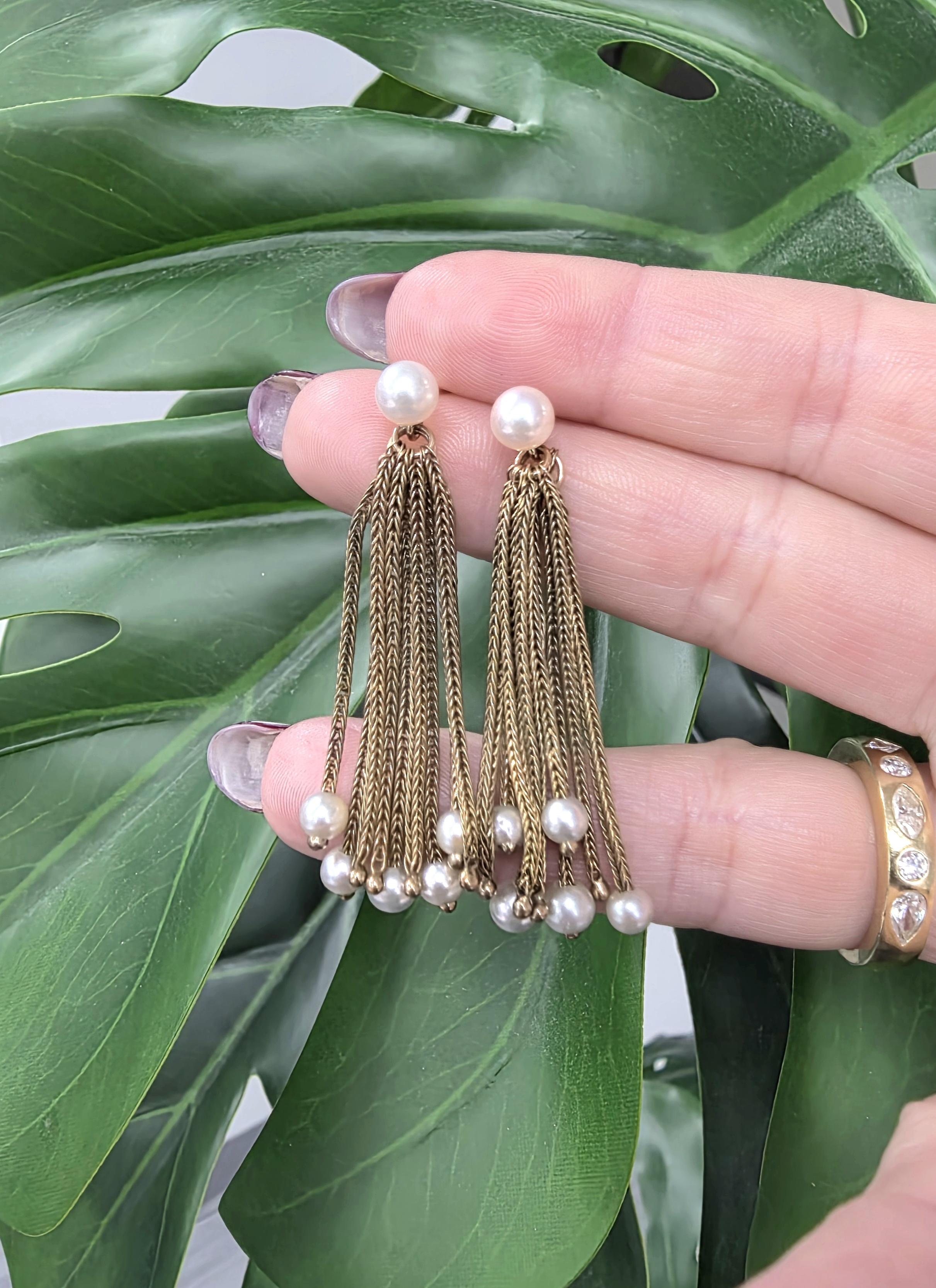 Vintage 14K Mesh Gold Chain Pearl Dangle Earrings