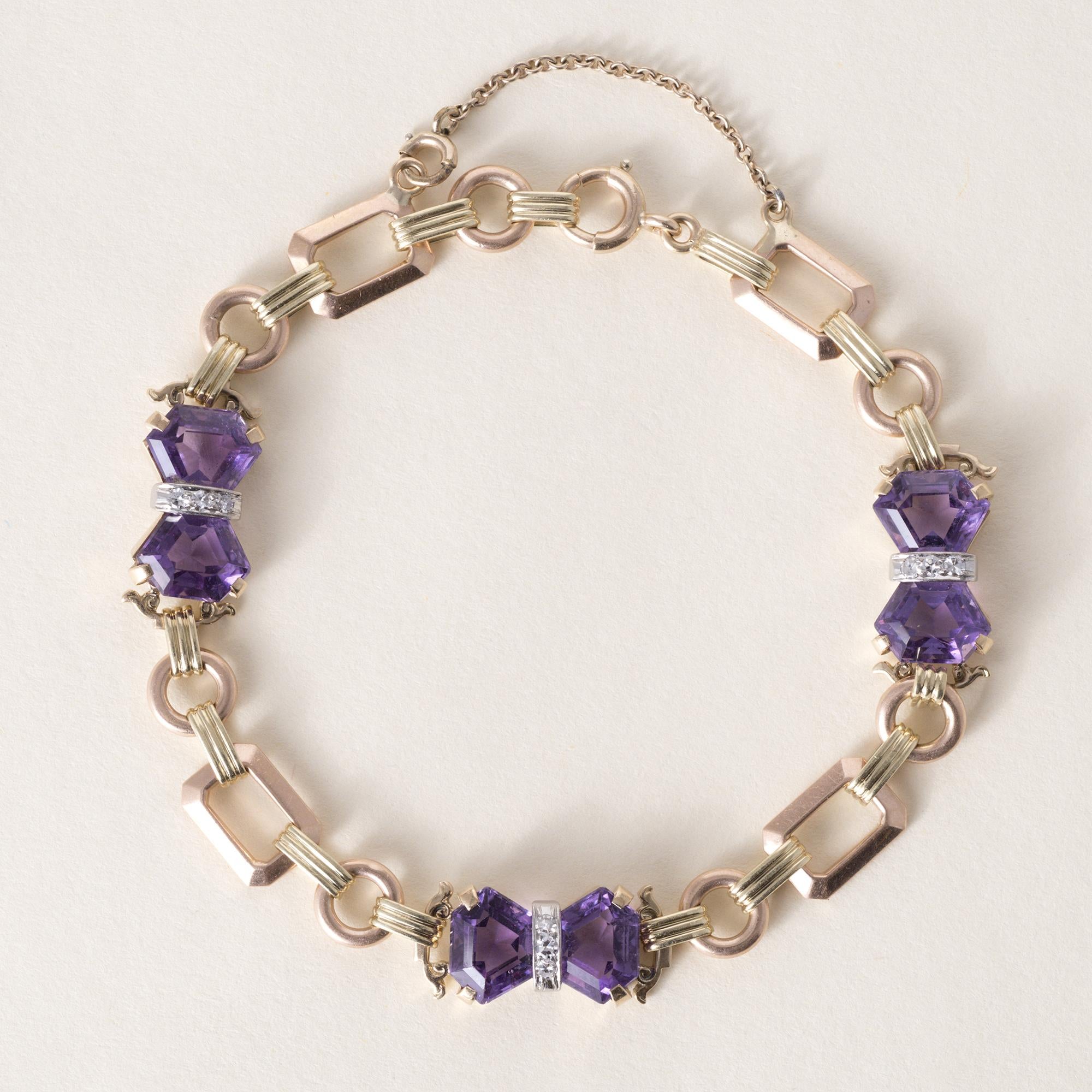 Vintage 14K Tri Gold Amethyst and Diamond Retro Bracelet