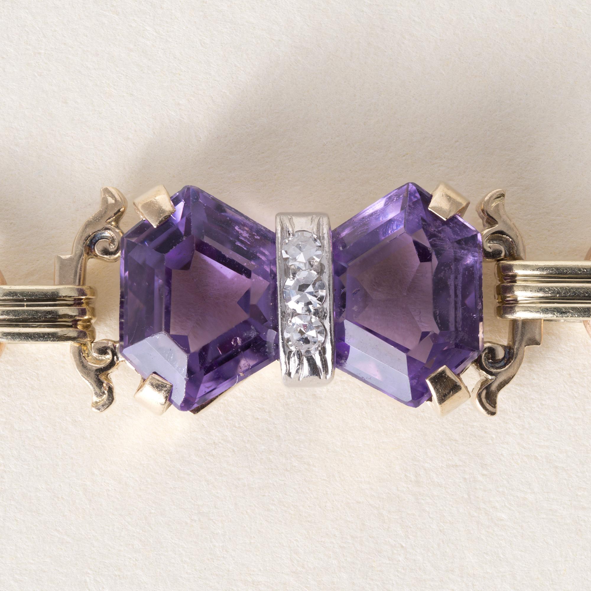 This is a retro tri gold bracelet featuring kite shape amethysts with single cut diamonds