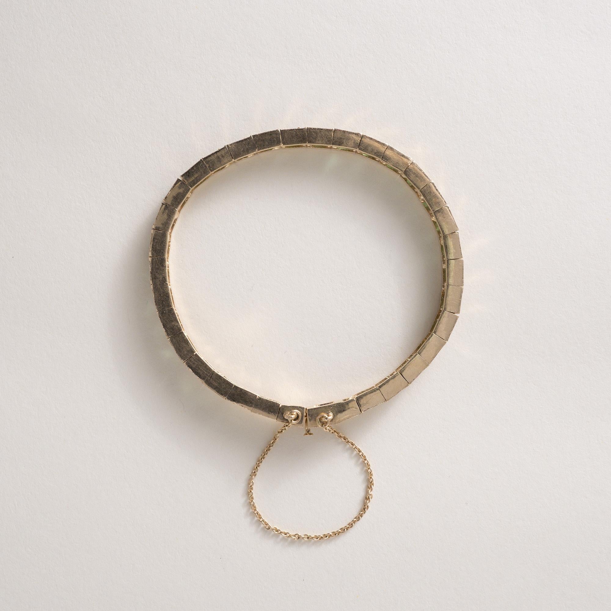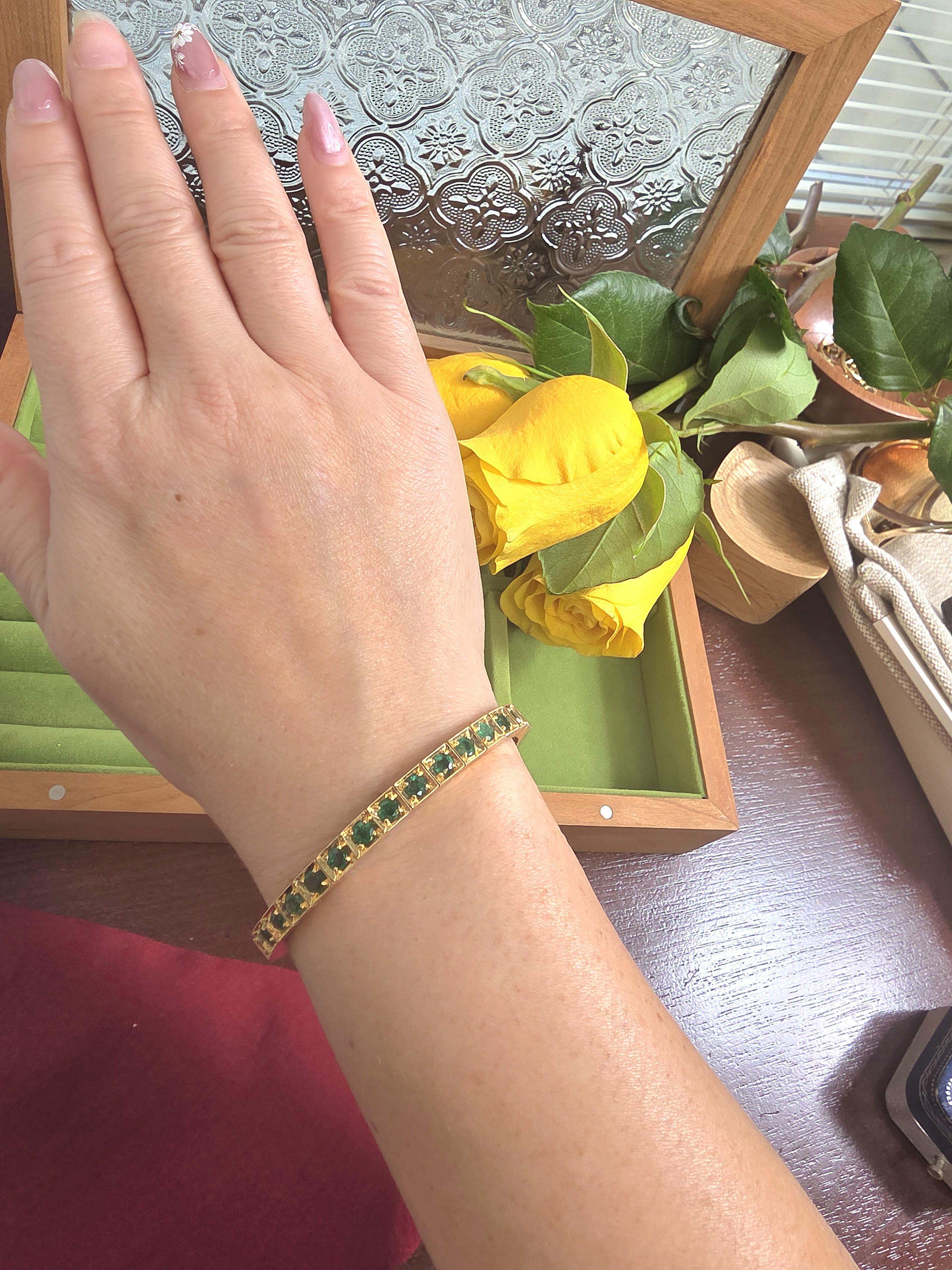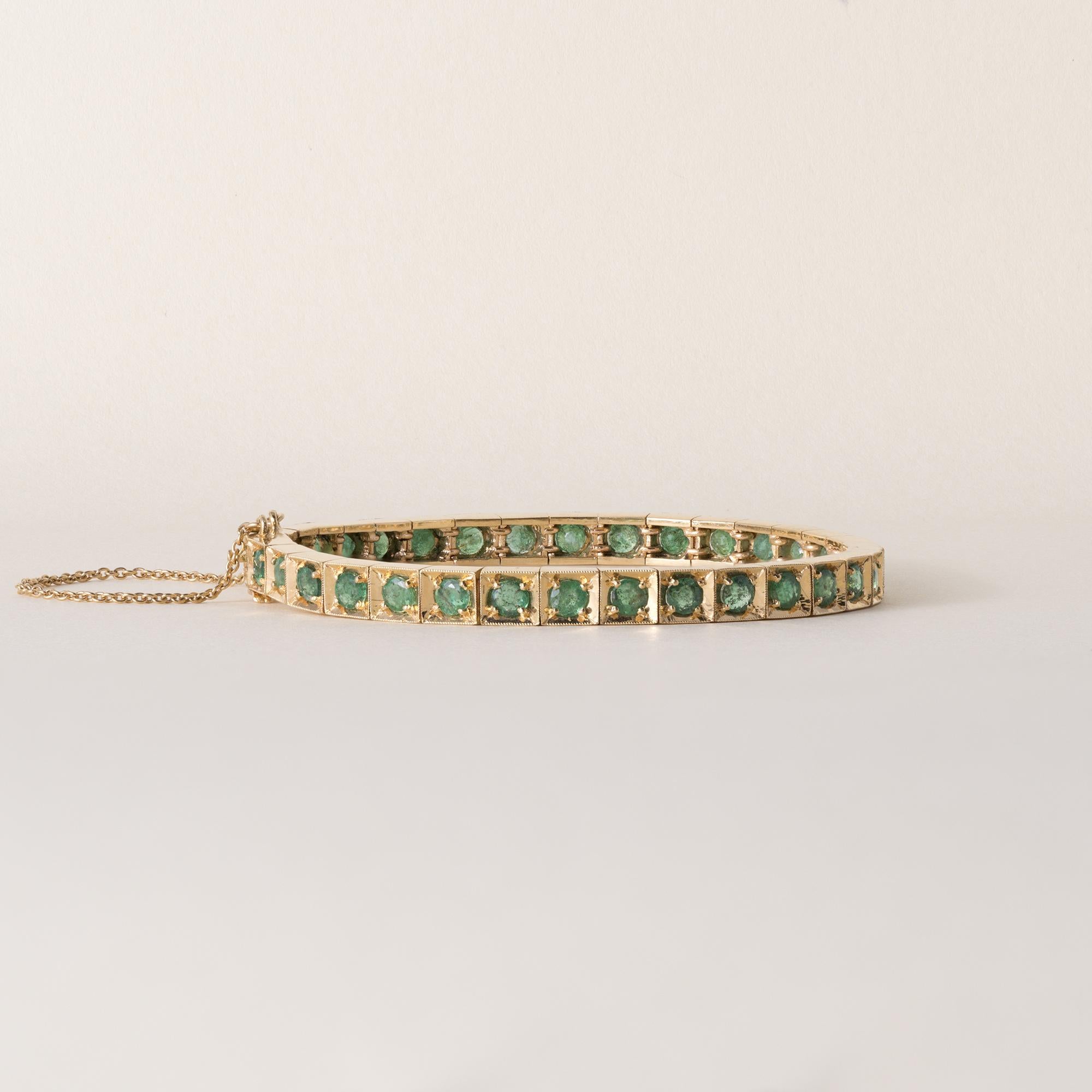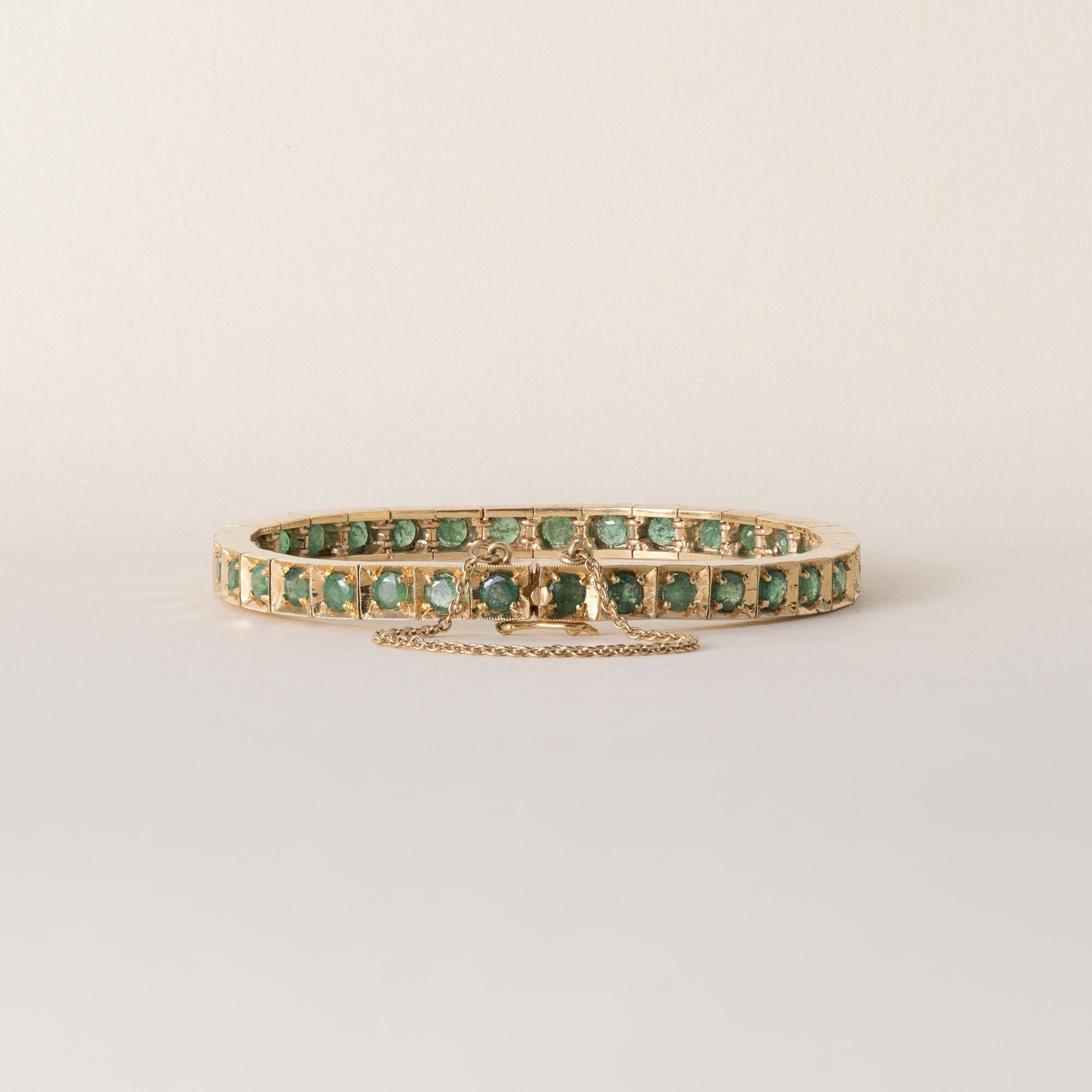 This is a vintage bangle featuring emeralds set in a flexible tennis bangle bracelet