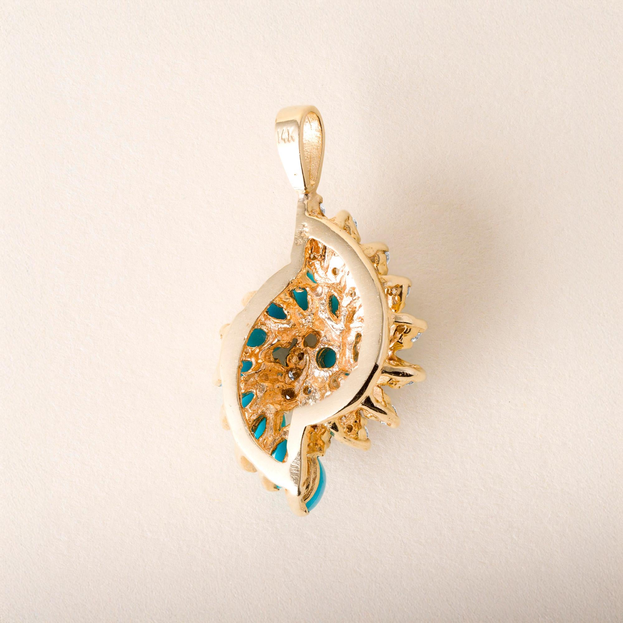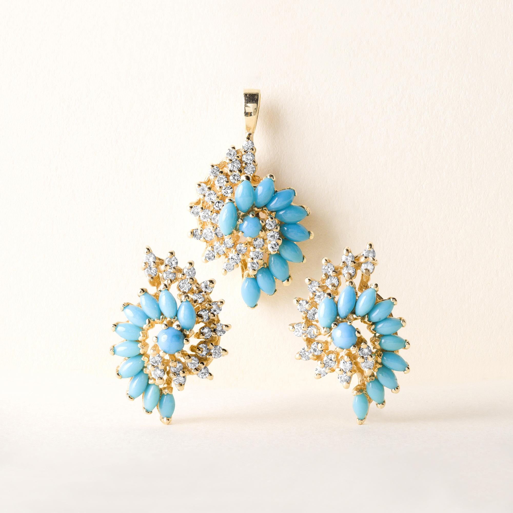 Vintage Turquoise and Diamond Swirl Earring and Pendant Set 14K Yellow Gold