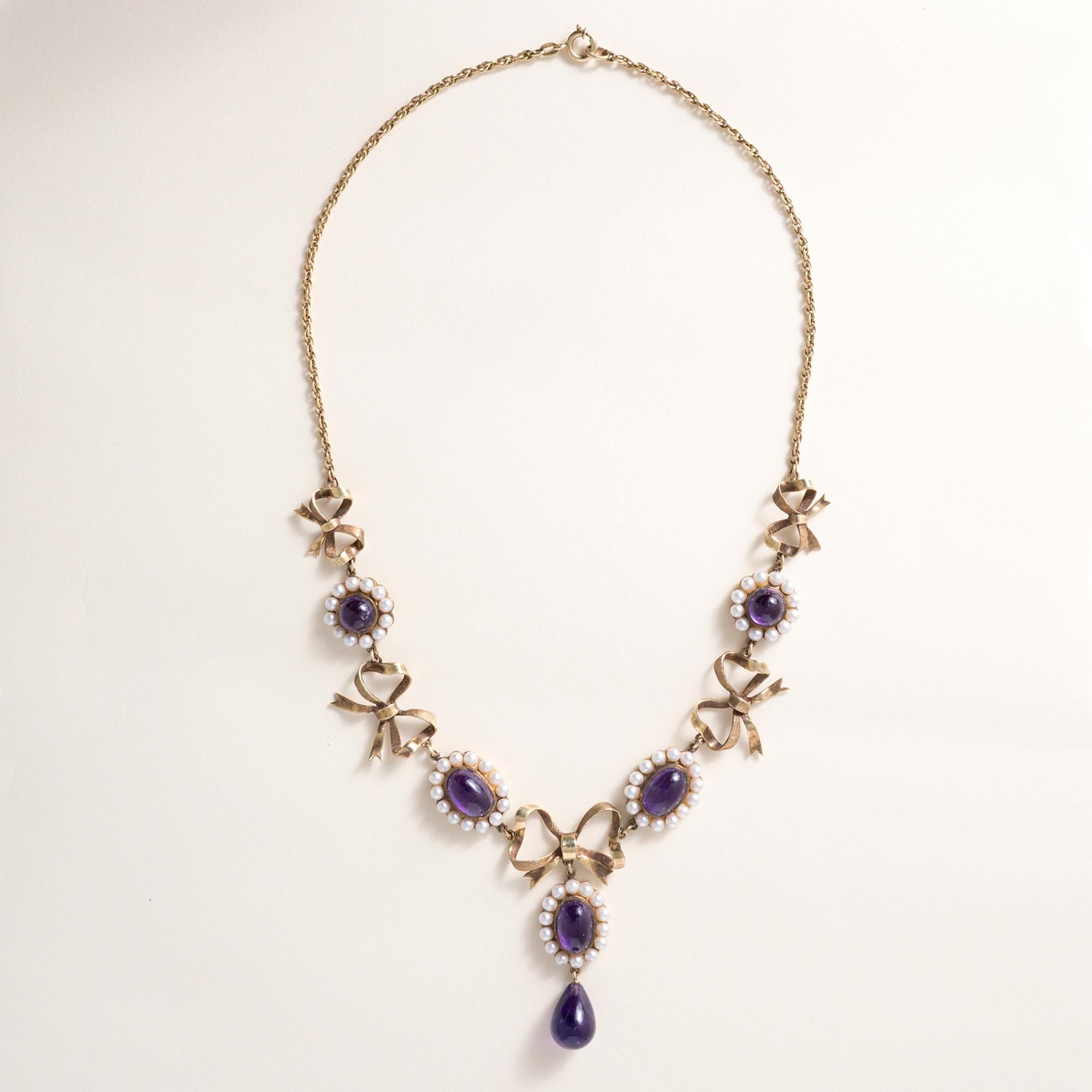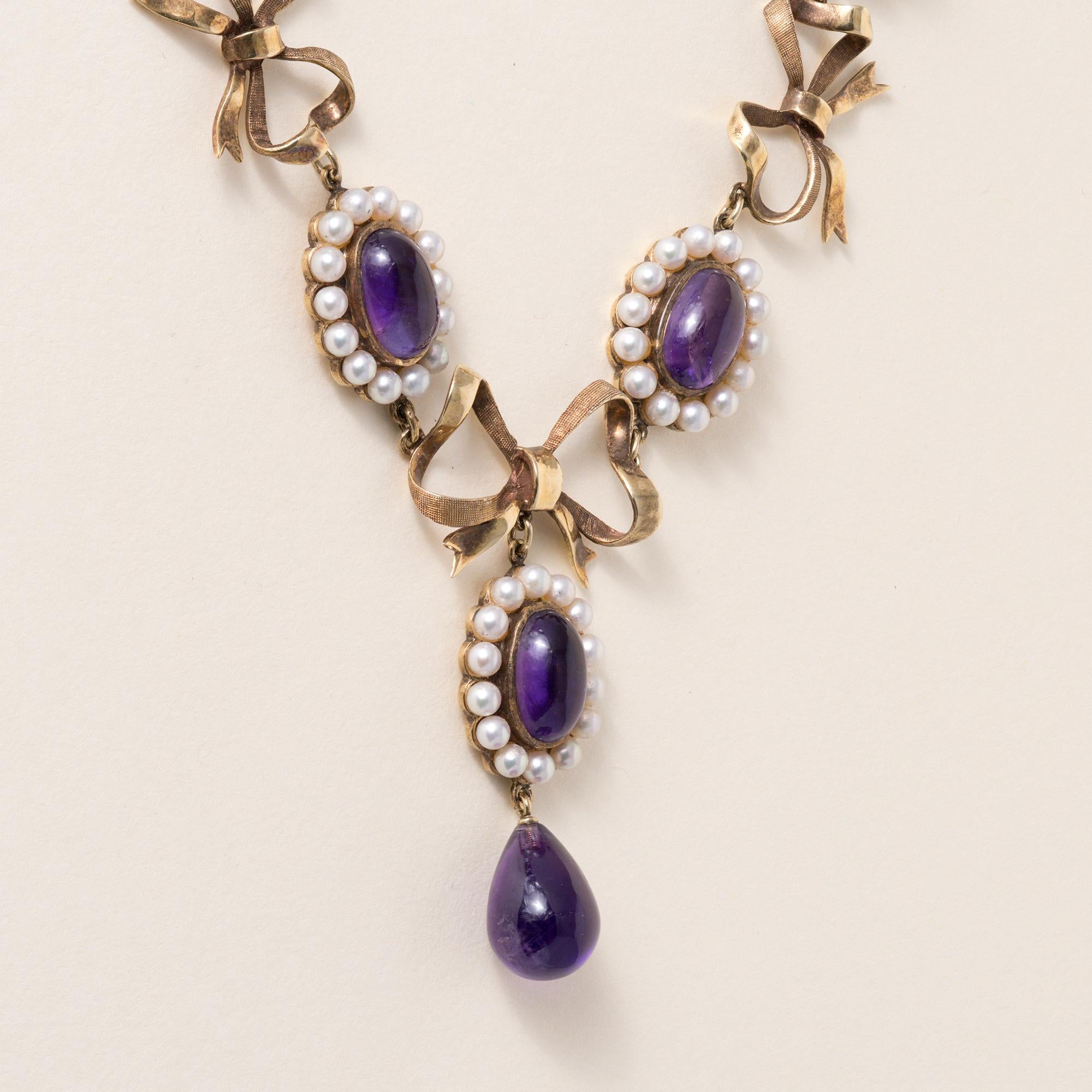 A beautifully romantic antique swag necklace from the late Victorian period, featuring vivid cabochon amethysts and delicate seed pearls, accented by an elegant bow motif. This refined design reflects the graceful aesthetic of the Art Nouveau and Belle Époque eras, celebrated for their flowing lines, natural forms, and feminine elegance.