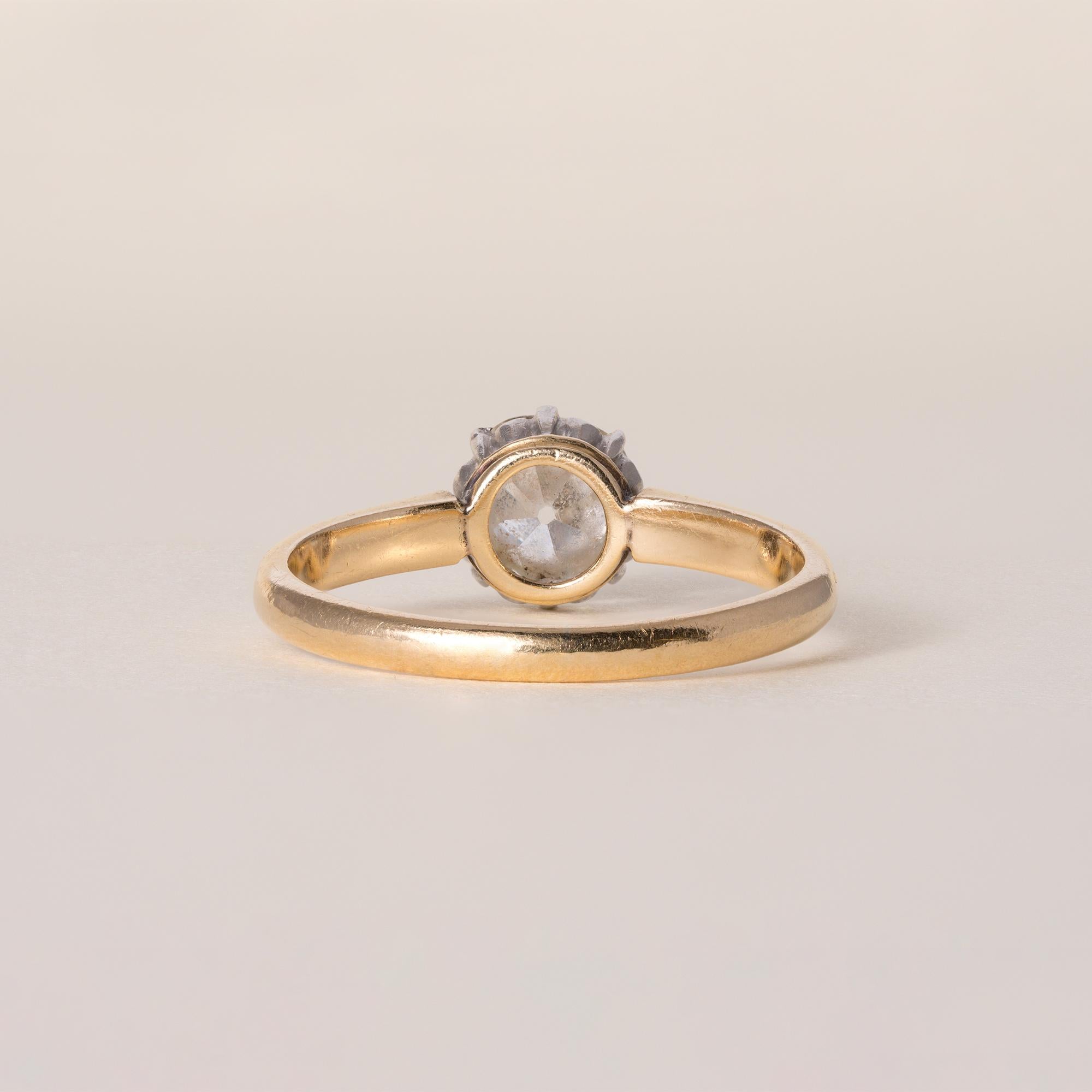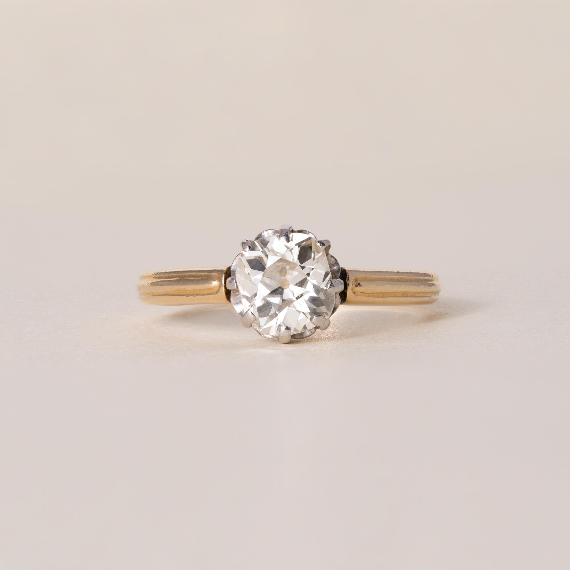 A beautifully preserved antique solitaire, this late 19th-century ring centers around a romantic old mine cut diamond, its softly rounded cushion shape reflecting the charm and craftsmanship of the era. Set in an elegant combination of rich yellow gold and platinum, the diamond is held securely in an eight-claw prong basket—an iconic detail of the time that enhances both brilliance and presence. The finely ribbed gold shank adds a layer of subtle texture and refinement, making this piece a timeless expression of antique sophistication and enduring beauty.