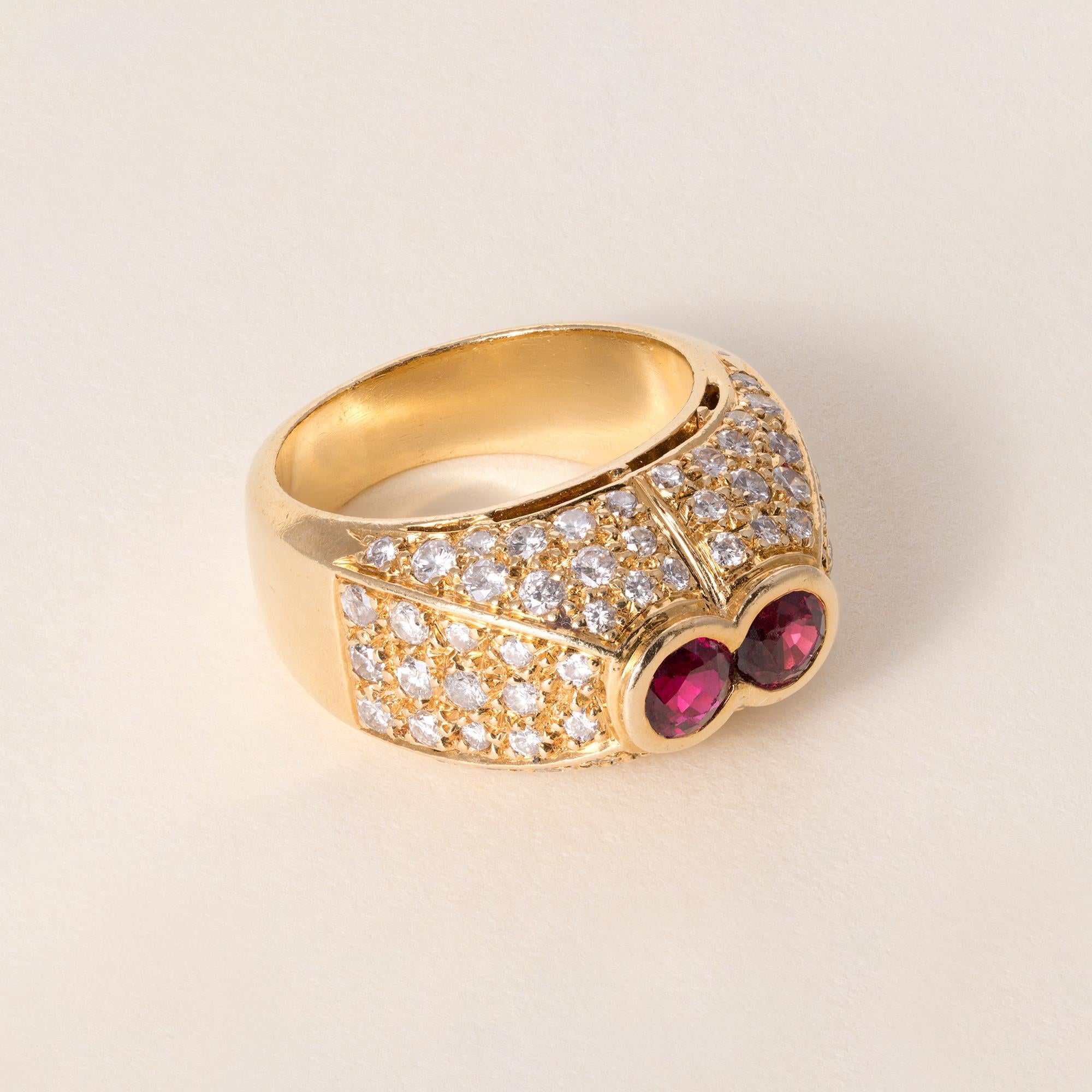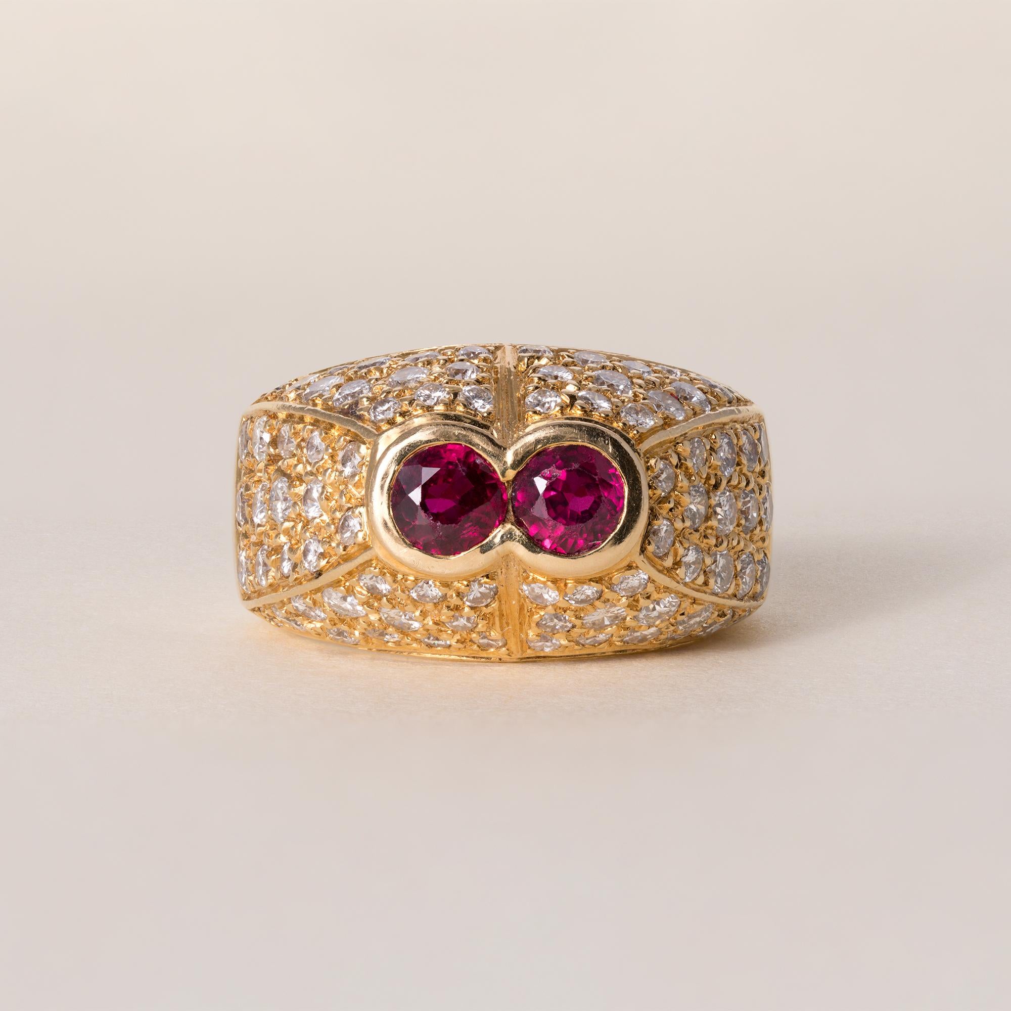 A bold and sculptural vintage ring showcasing a striking interplay of color and brilliance. Two vivid red rubies sit prominently in smooth bezel settings, rising above a dramatic pavé diamond dome. The richly saturated rubies provide a powerful focal point, while the surrounding field of diamonds forms a luminous pyramid, catching light from every angle.