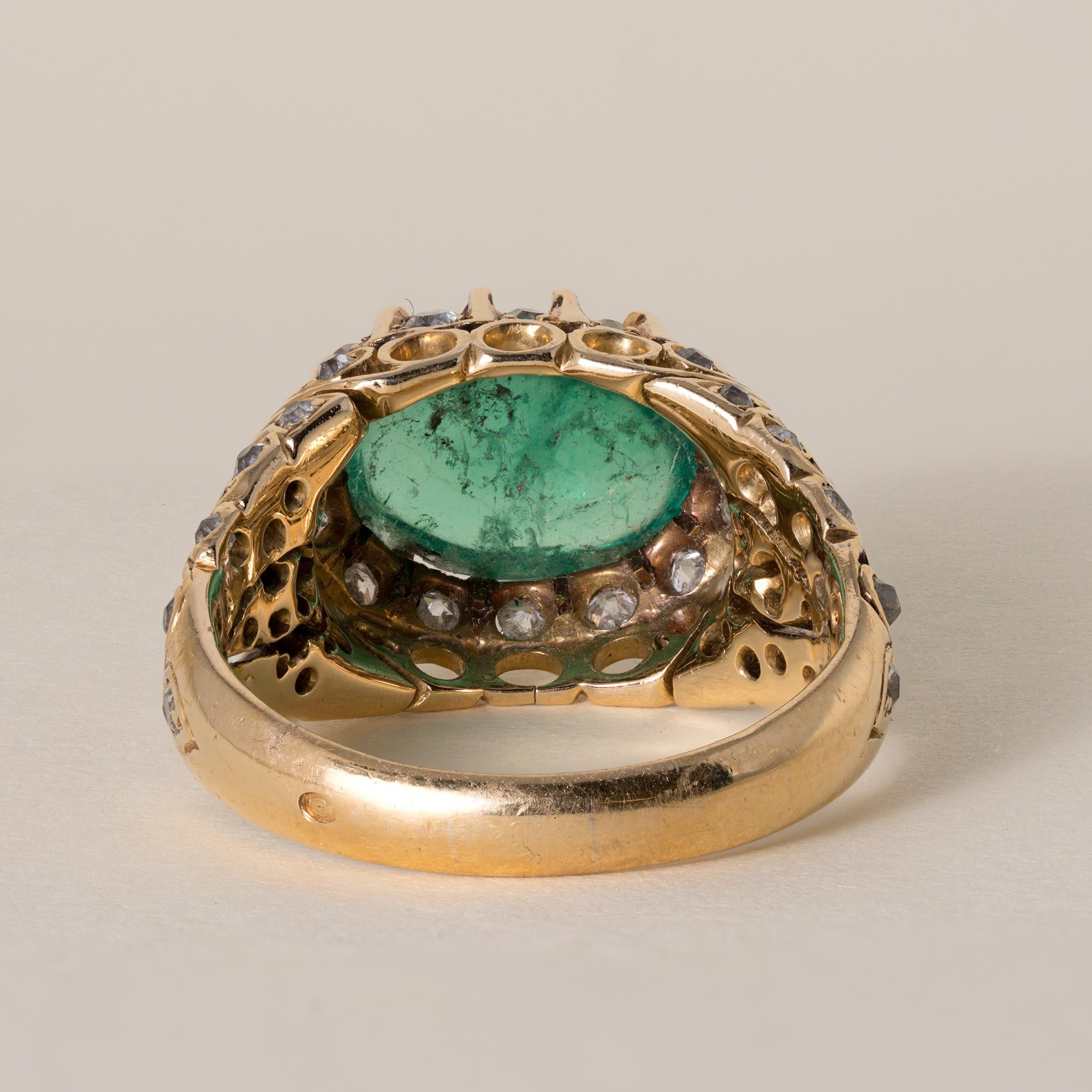 A striking expression of vintage elegance, this ornate ring showcases a vivid Colombian emerald cabochon framed by glittering old mine cut diamonds. Crafted in the spirit of Victorian design and produced during the 1960s revival period, this exceptional piece reflects timeless artistry and refined craftsmanship. The luminous emerald is securely elevated in an intricate claw setting, serving as both a functional and decorative centerpiece. Its rich color and cabochon finish are beautifully complemented by antique-cut diamonds, creating depth, warmth, and romantic appeal.