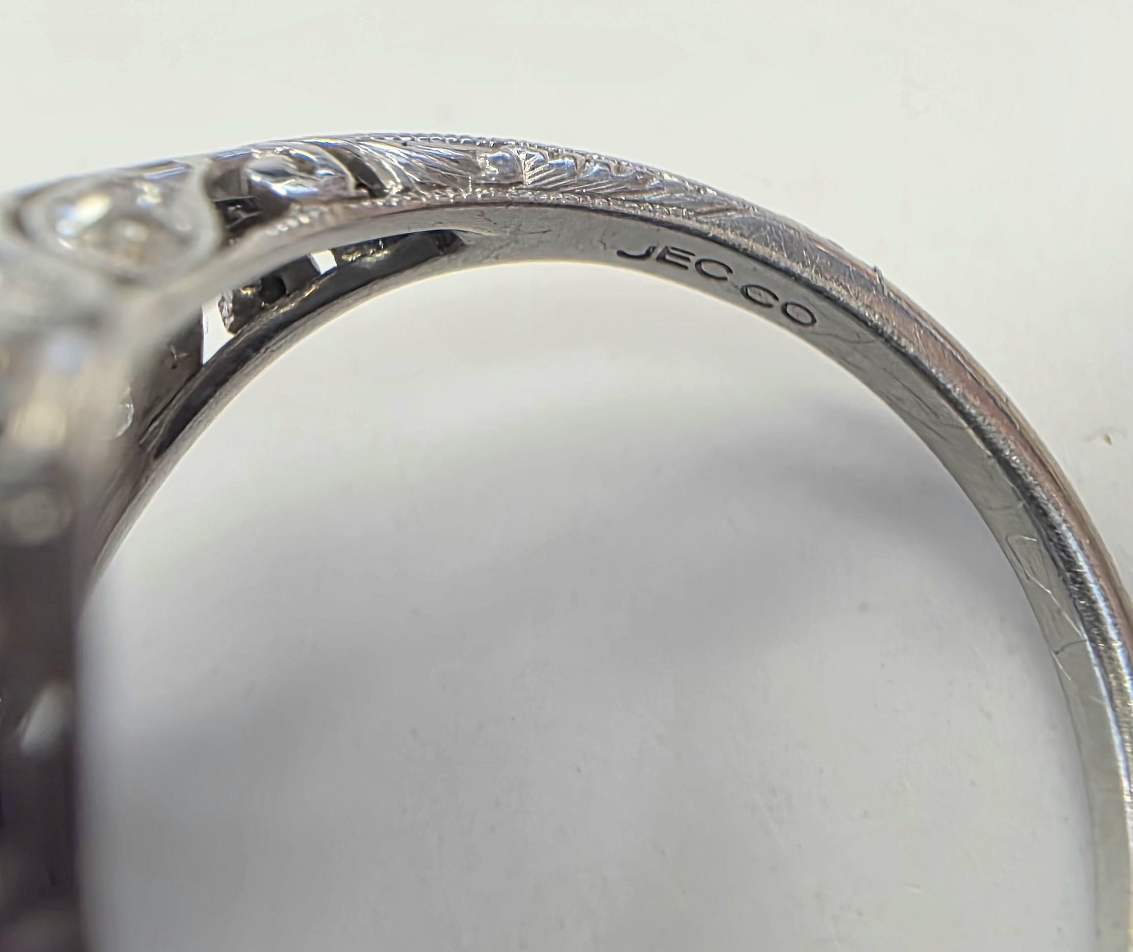 An exceptional example of American Art Deco craftsmanship, this antique ring was created by the prestigious Philadelphia jeweler J.E. Caldwell & Co., one of the most respected luxury retailers of the early 20th century. The ring is signed “JEC Co.” inside the shank, confirming its Caldwell origin.