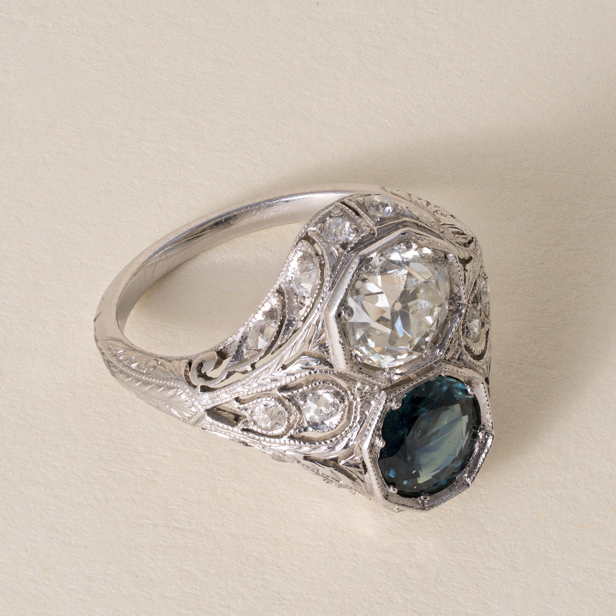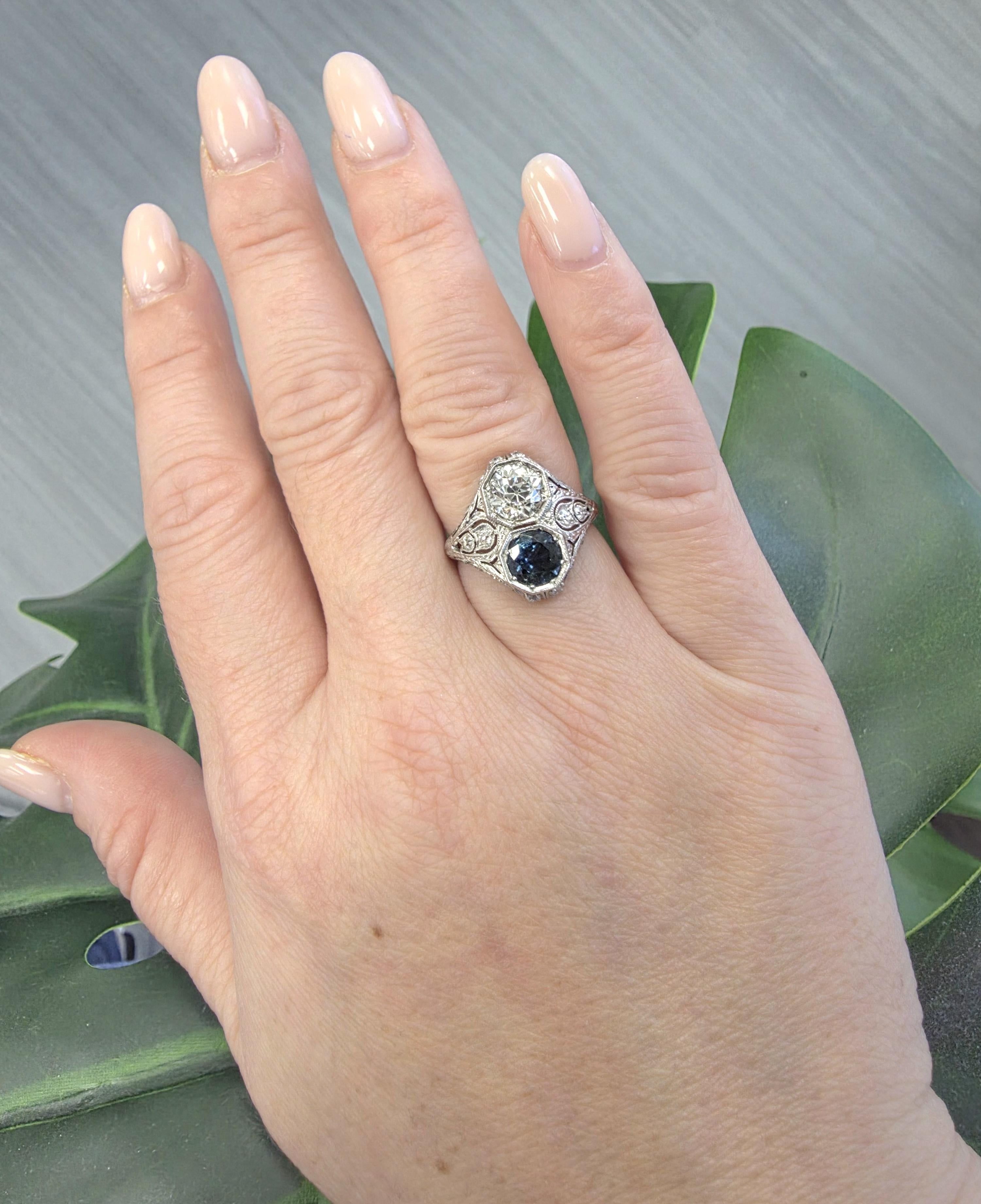 J.E Caldwell Sapphire & 1.10ct Old European Cut Diamond Art Deco Platinum Ring