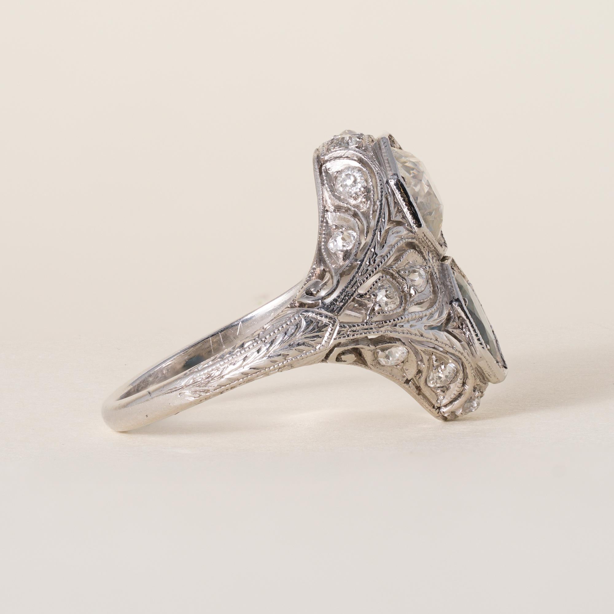 Crafted in solid platinum, the design features exquisite hand-engraved filigree detailing throughout, reflecting the refined artistry and precision of the Art Deco era.