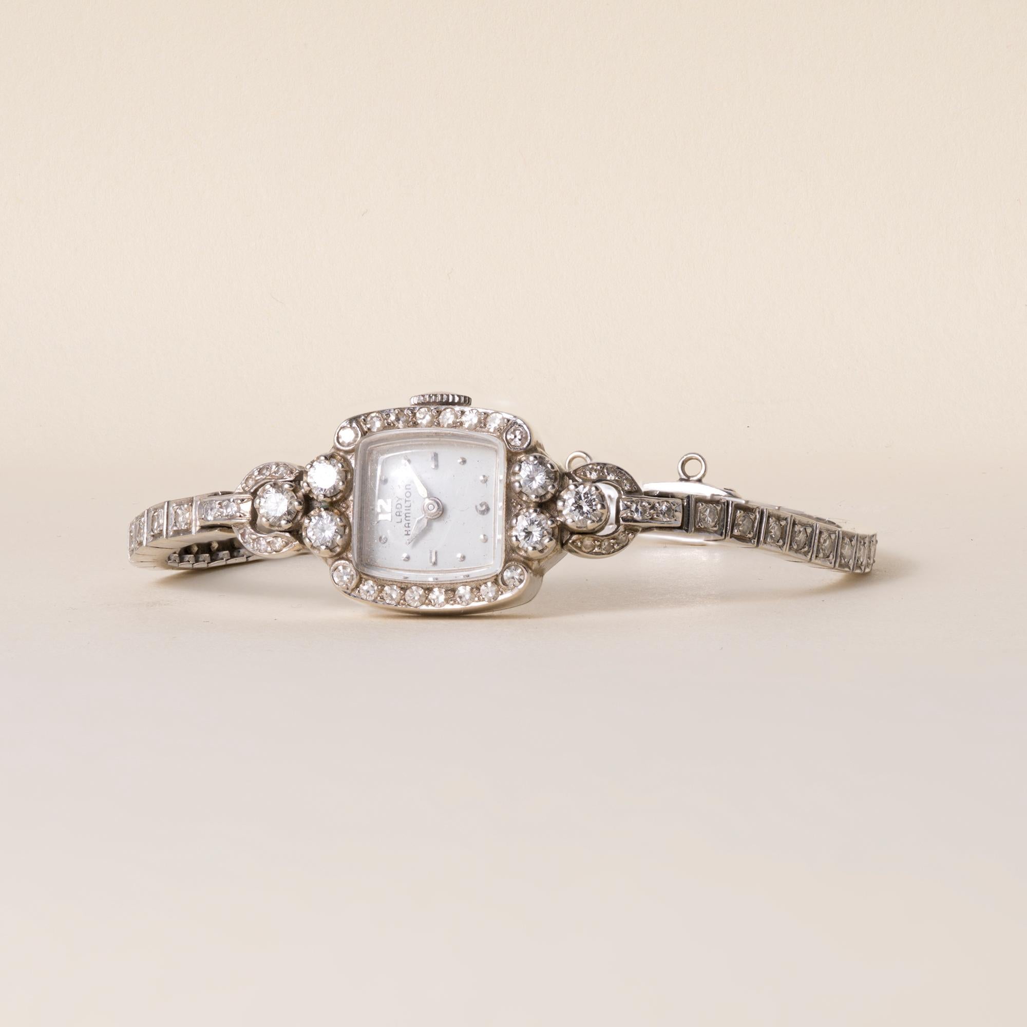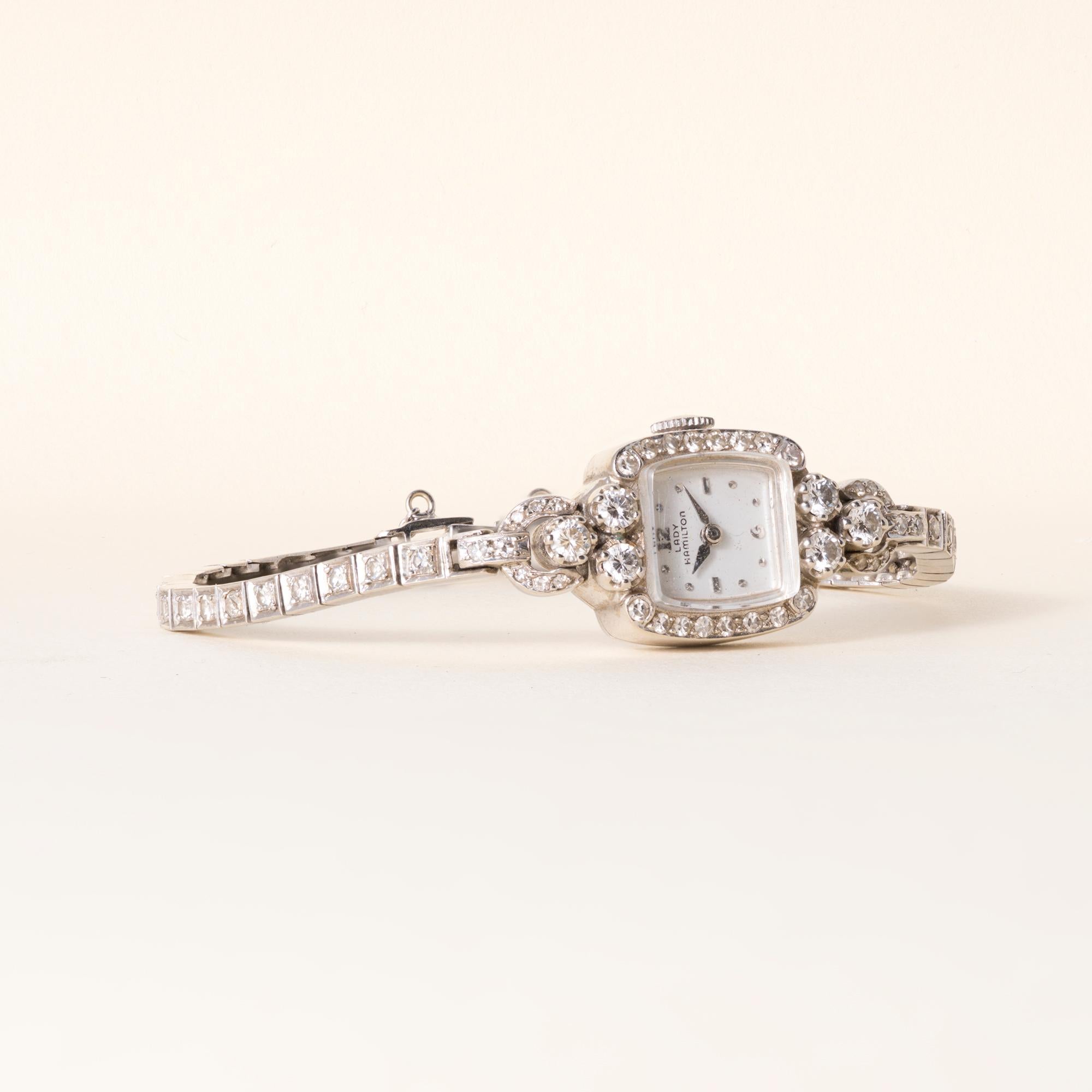 Vintage Lady Hamilton ladies’ wristwatch in 14K white gold, Art Deco-inspired, circa 1950s.