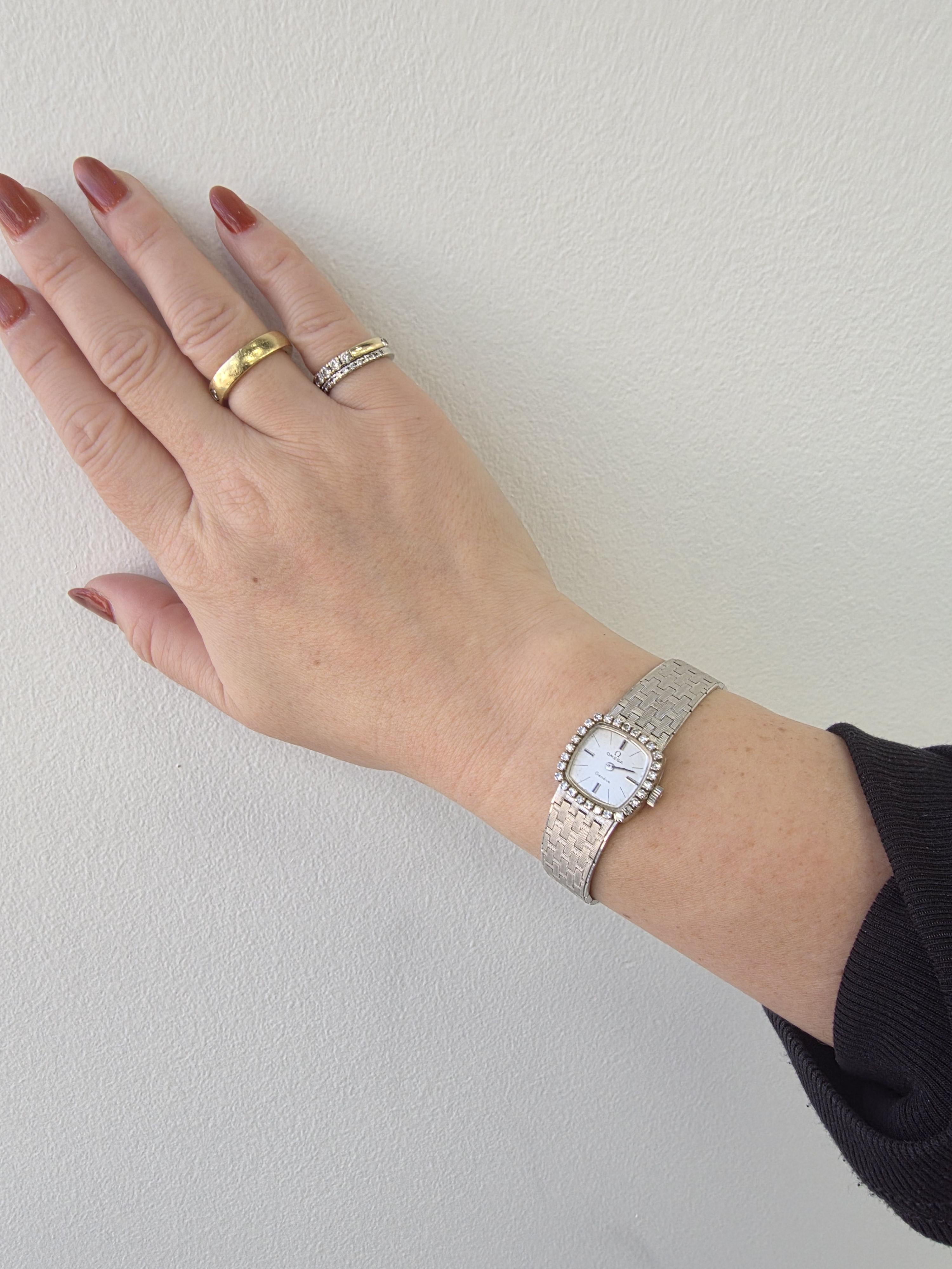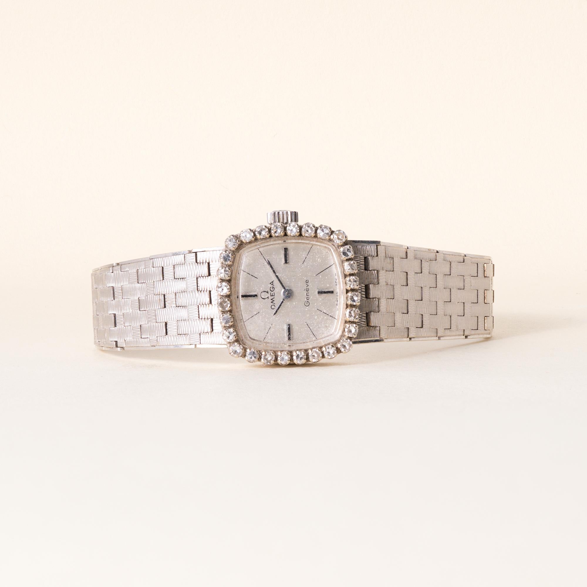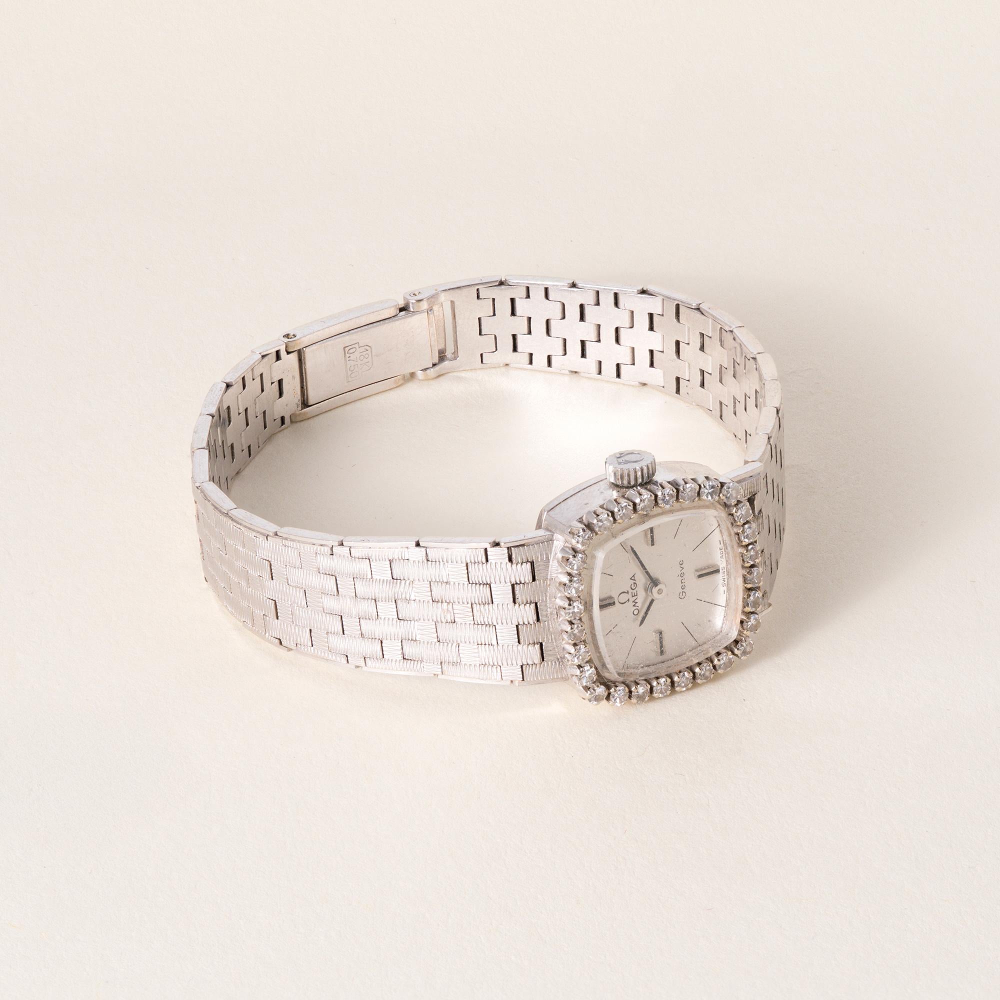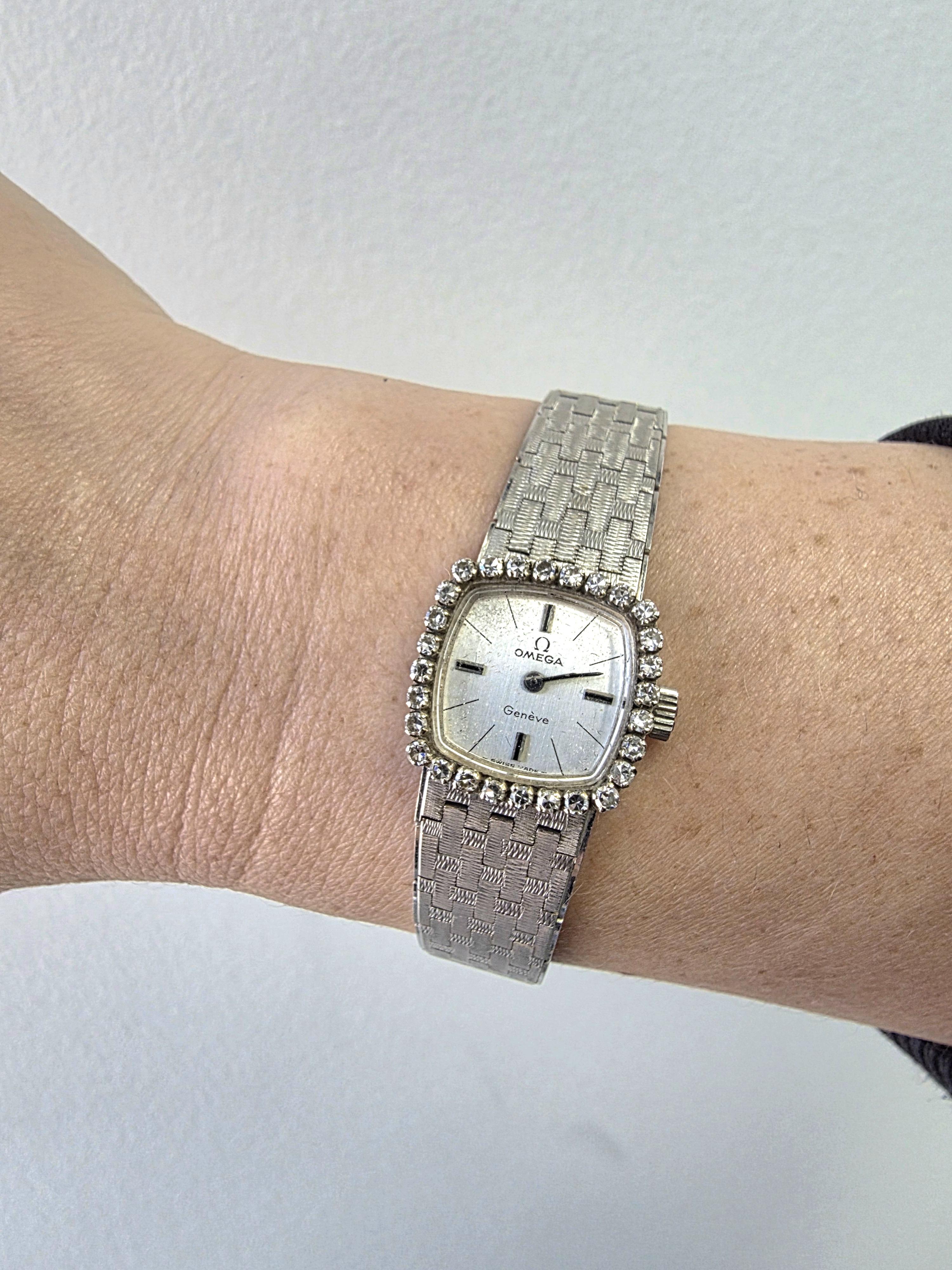 This is a gorgeous vintage ladies’ Omega Genève cocktail wristwatch in solid 18K gold, dating to the 1950s, with a classic diamond-set design that feels both elegant and timeless.