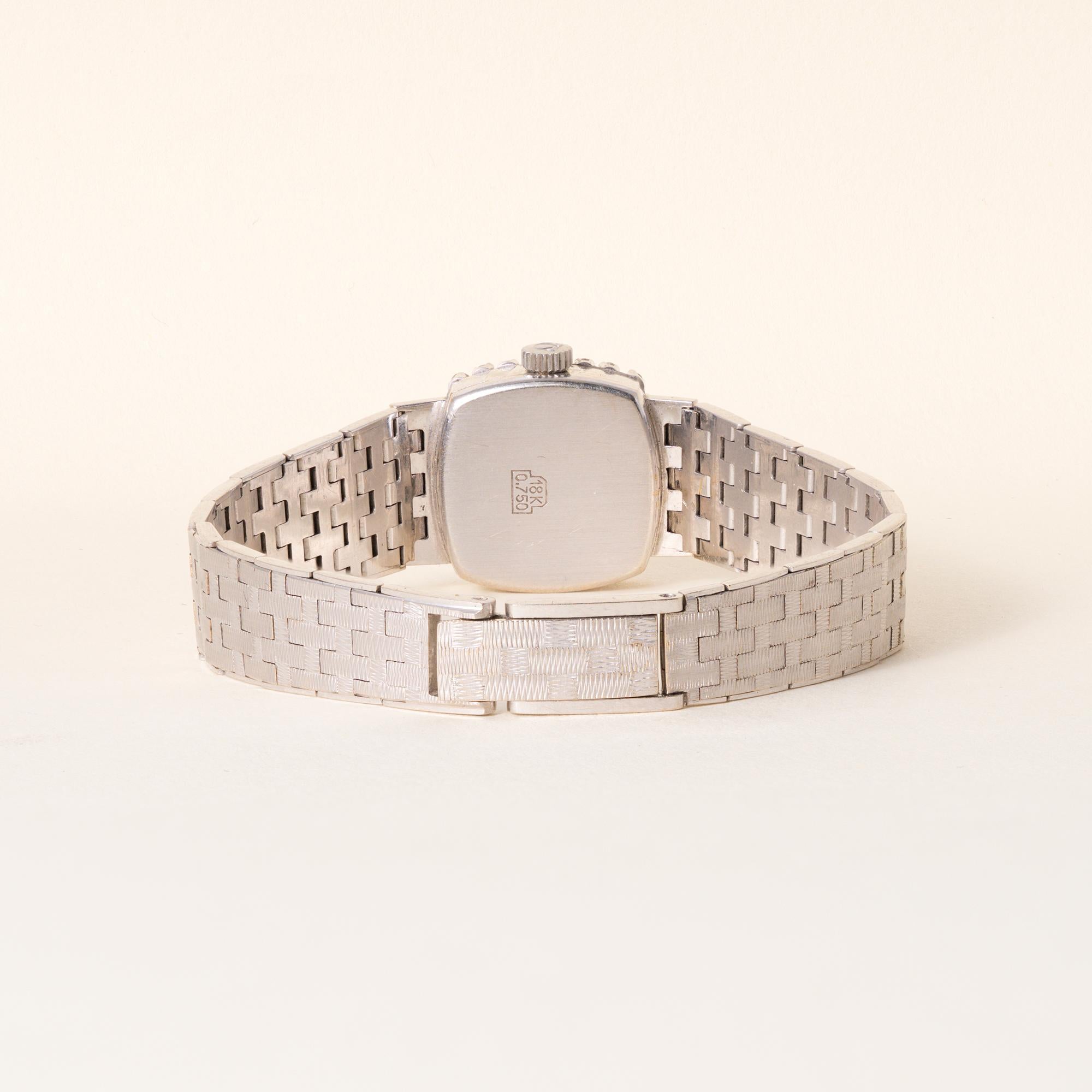 The square cushion case is framed by a diamond bezel set with 28 single cut diamonds, offering soft sparkle that complements the refined proportions of the watch. The satin silver dial features raised baton numerals at the 12, 3, 6, and 9 o’clock positions, along with the Swiss Made mark beneath 6 o’clock, maintaining the clean mid-century aesthetic. An integrated woven “amati” style bracelet completes the piece, giving it a fluid, jewelry-like presence on the wrist.
