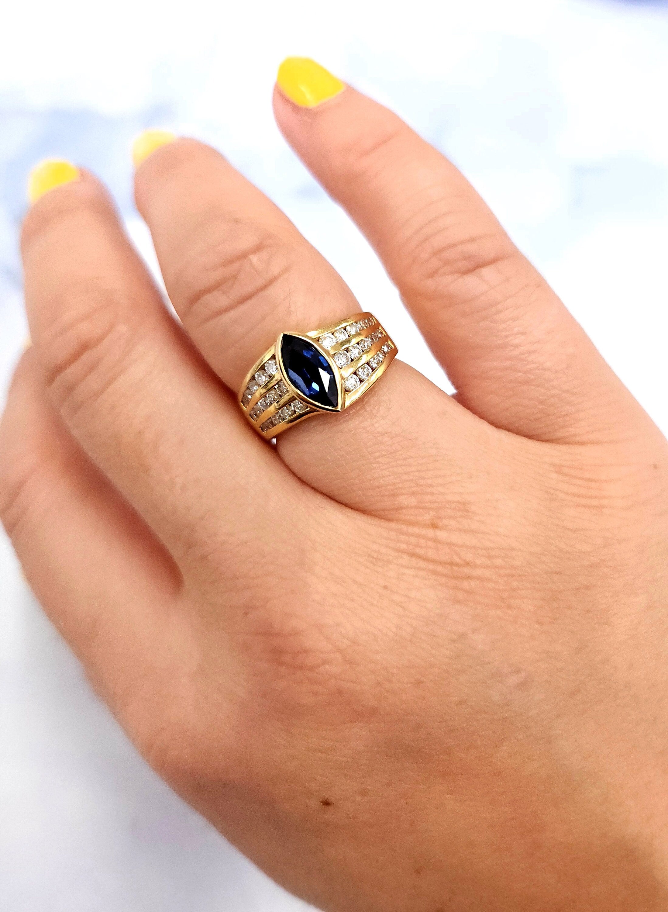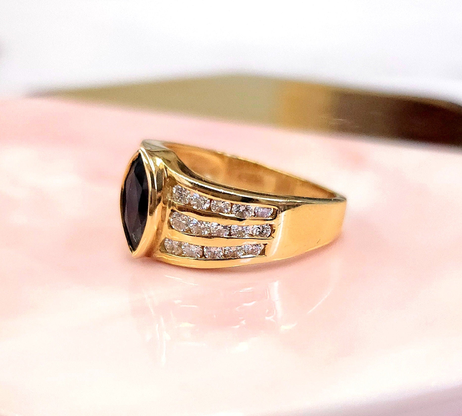 This is a vintage gold band featuring a marquise cut natural