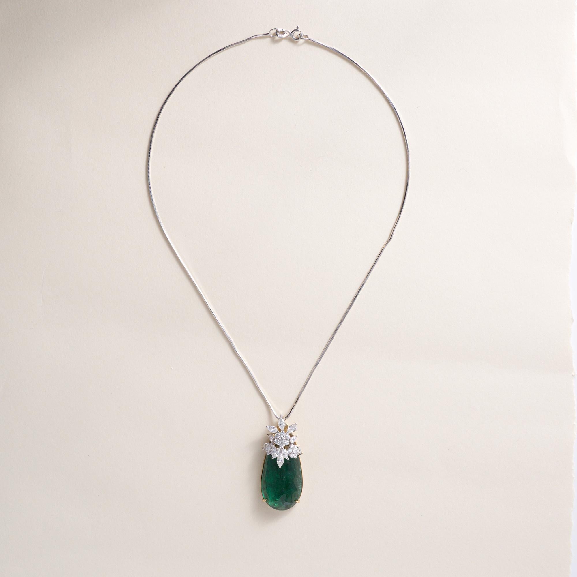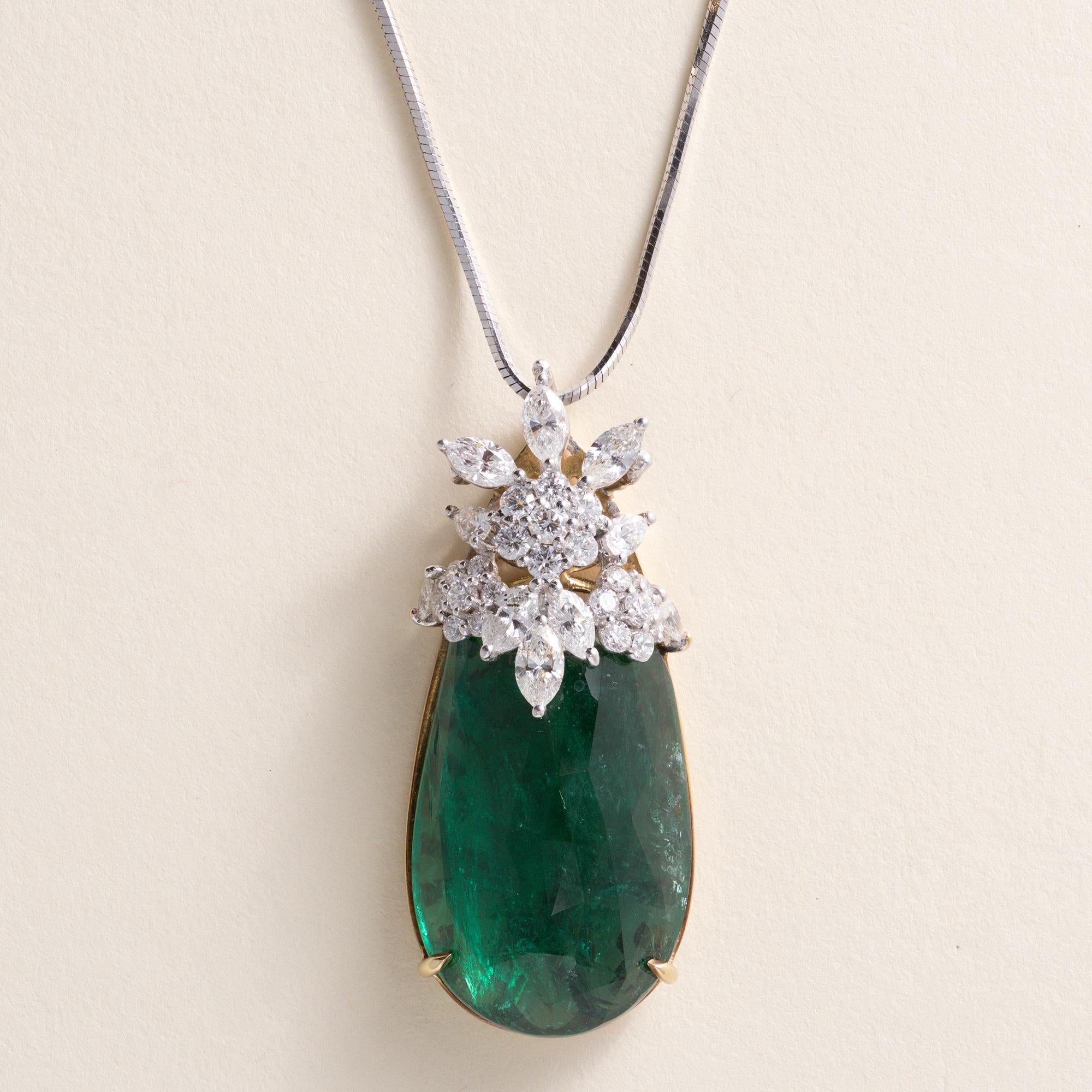 The pendant features a dramatic briolette-cut Zambian emerald weighing an impressive 27.98 carats, displaying a deep, lush green color.