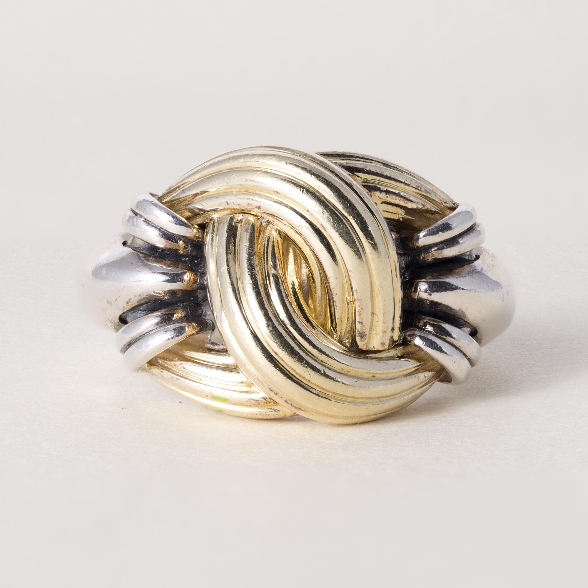 The ring features intertwined 18K yellow gold and sterling silver ribbons, forming a bold yet refined knot motif that symbolizes strength and unity. The contrasting metals highlight LAGOS’ mastery of texture and proportion, with a high-polish finish that enhances its graceful curves.