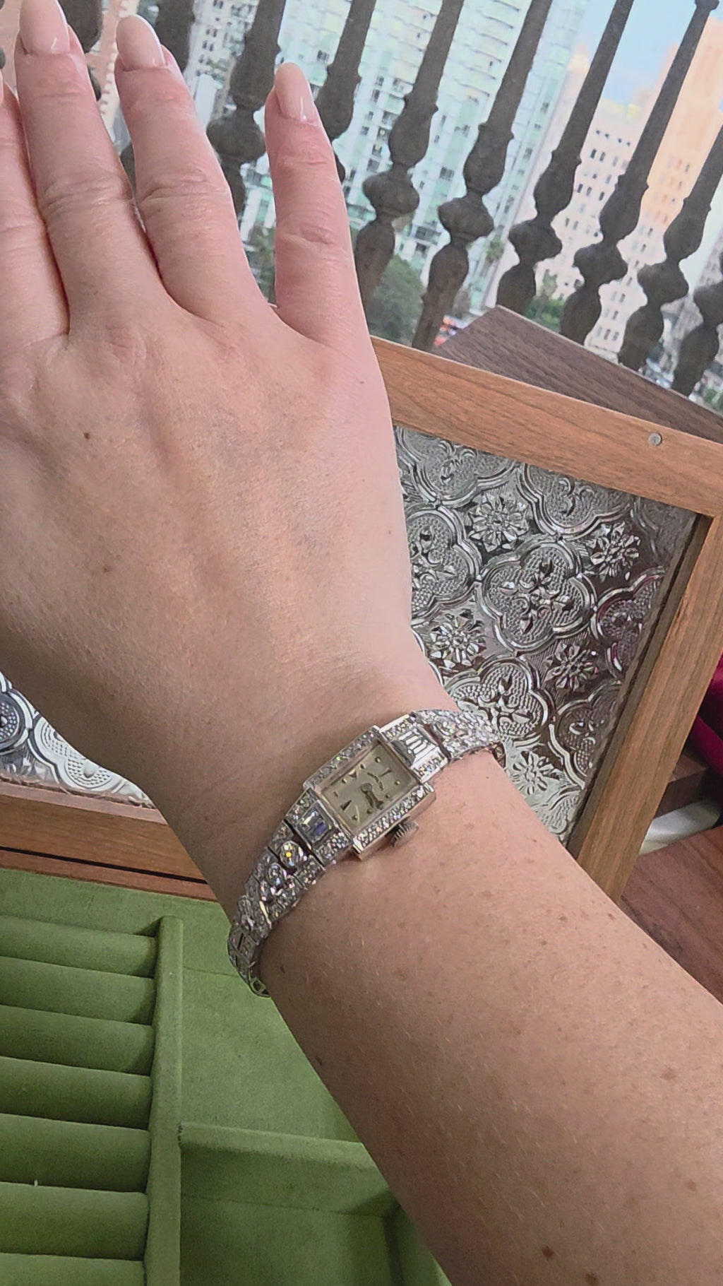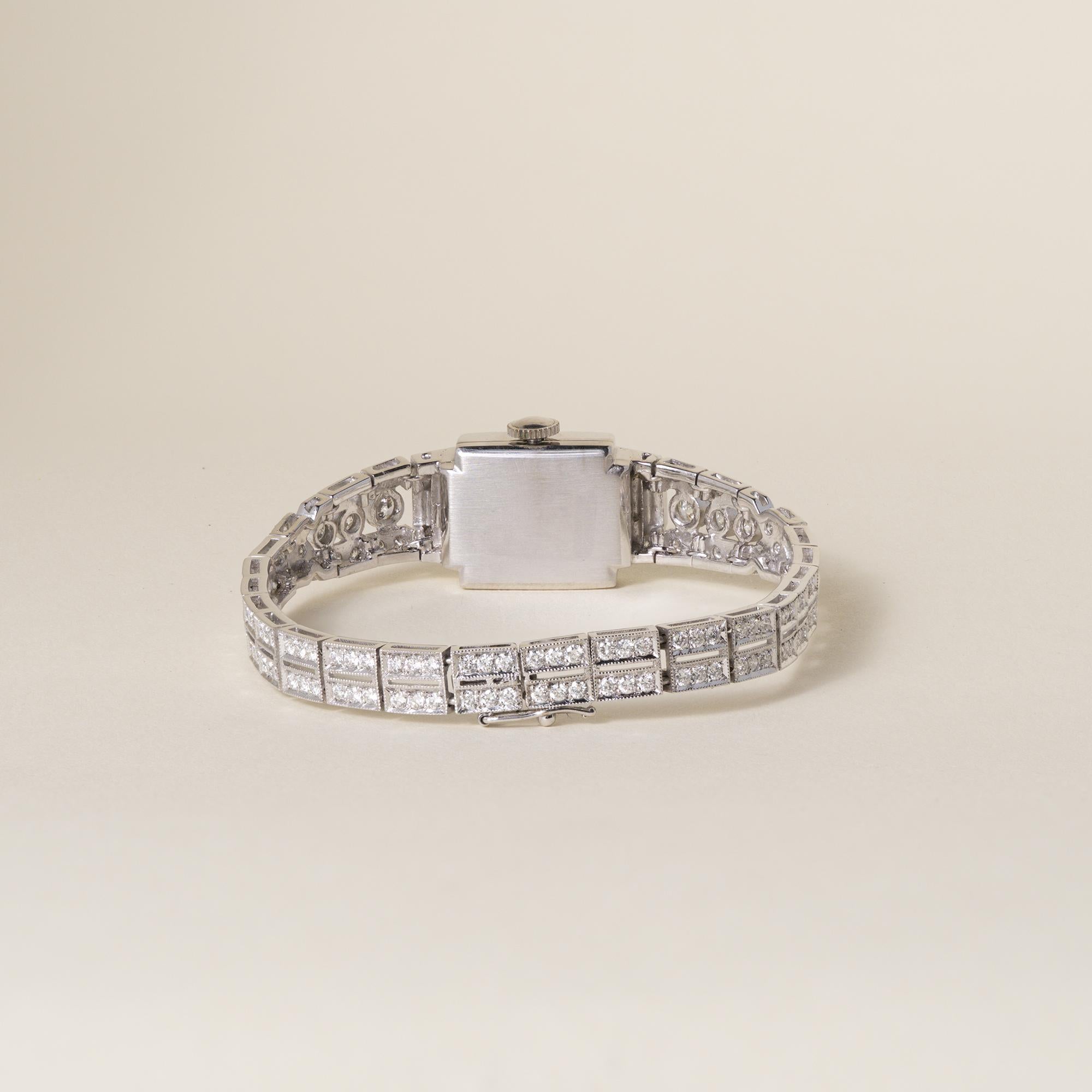 The rectangular case frames a sophisticated silver satin dial. Round brilliant and baguette diamonds are meticulously set throughout the bracelet and central plaque, while single-cut diamonds accent the frame of the case, creating dimension and period-correct sparkle. The prong- and bezel-set stones flow seamlessly into the bracelet, emphasizing both flexibility and visual continuity.