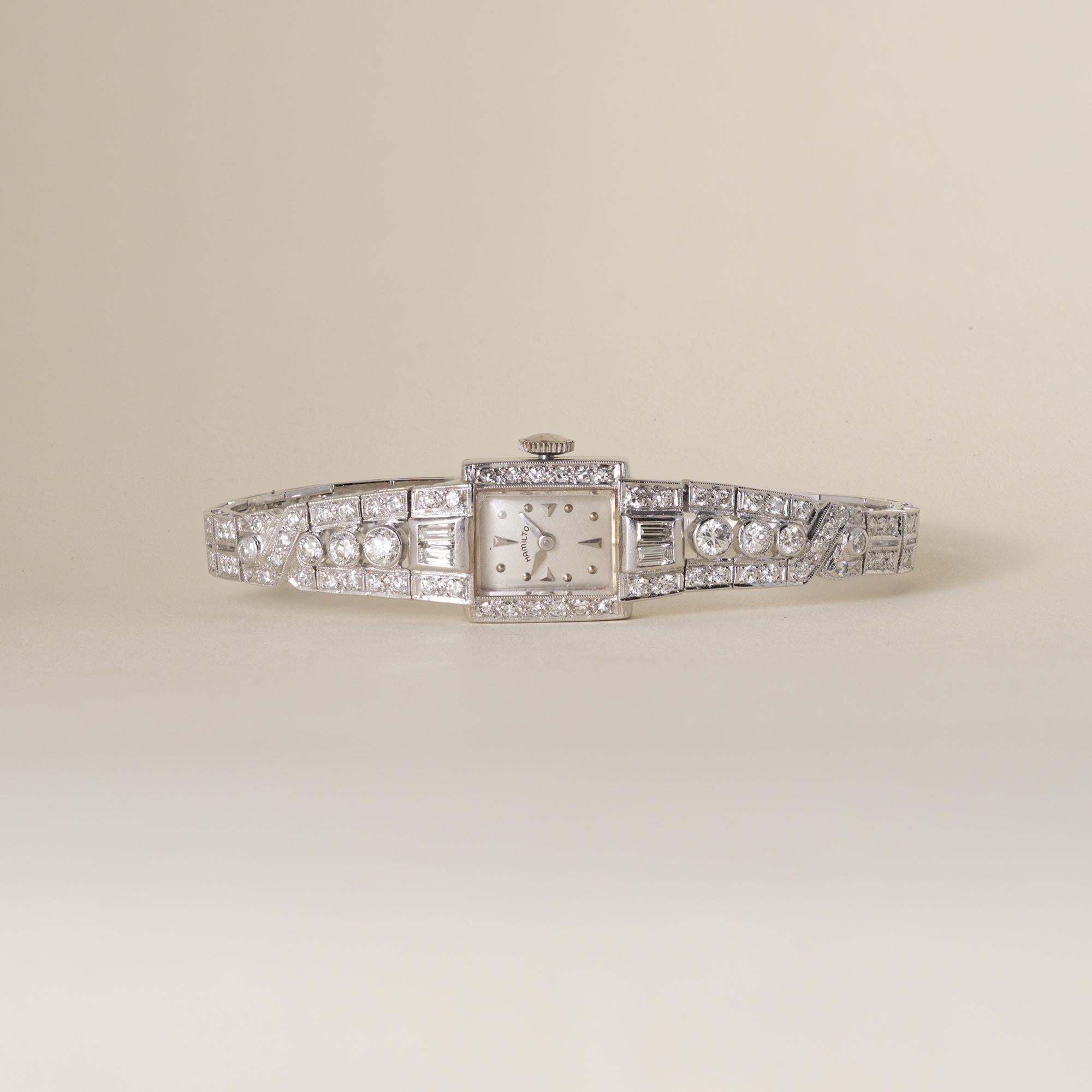 A striking example of mid-century elegance, this vintage Hamilton diamond watch showcases refined proportions and exceptional craftsmanship characteristic of the 1950s. Executed in platinum, the design balances architectural clarity with luminous diamond detailing, resulting in a timepiece that functions equally as fine jewelry.
