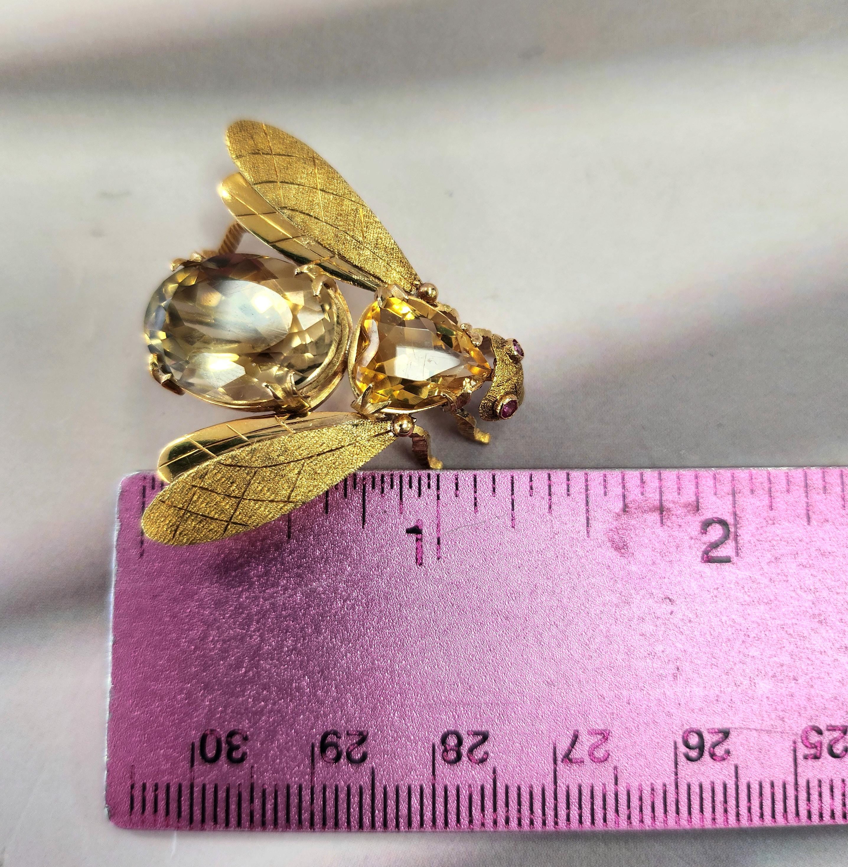 Add a whimsical touch to your collection with this stunning vintage fly brooch, handcrafted in Italy. This exquisite piece features delicately etched 18k gold wings, a radiant natural citrine body, and vibrant ruby eyes, combining artistry with elegance.